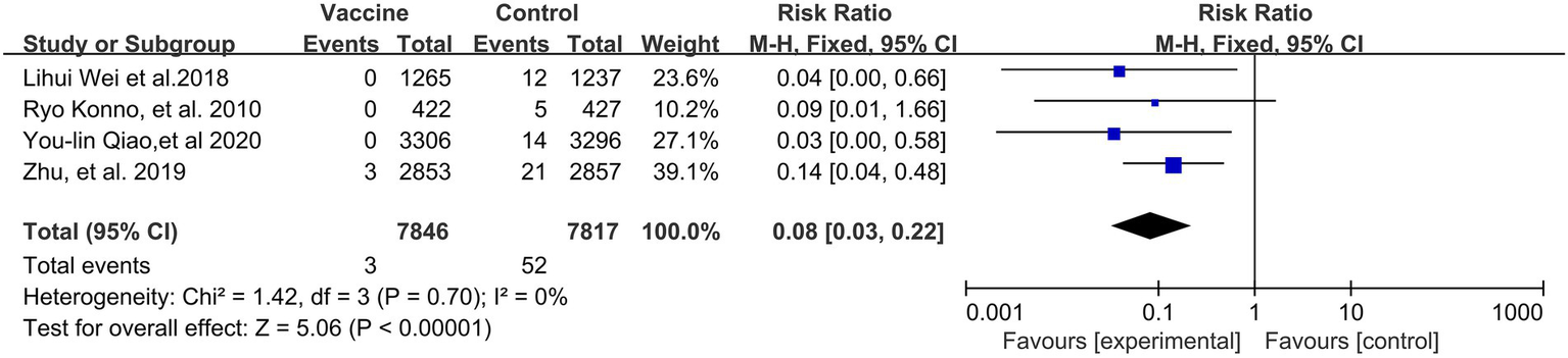 A preventive effect of HPV vaccination on the incidence of CIN1+ (4 RCTs: 15,717 participants; Figure 3) was observed, with a pooled RR of 0.08 (95% CI, 0.03–0.22); no significant heterogeneity was observed among the involved studies (I2 = 0%; p = 0. 70).