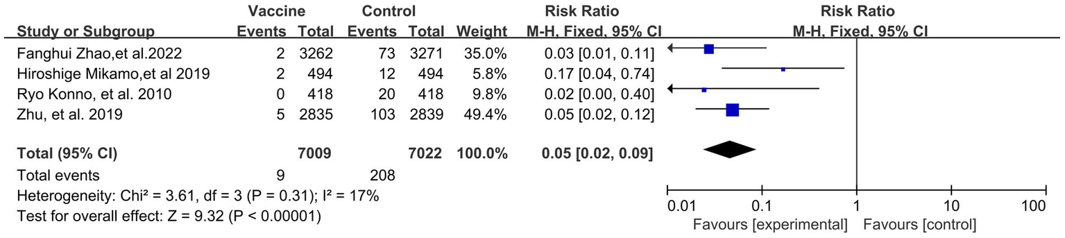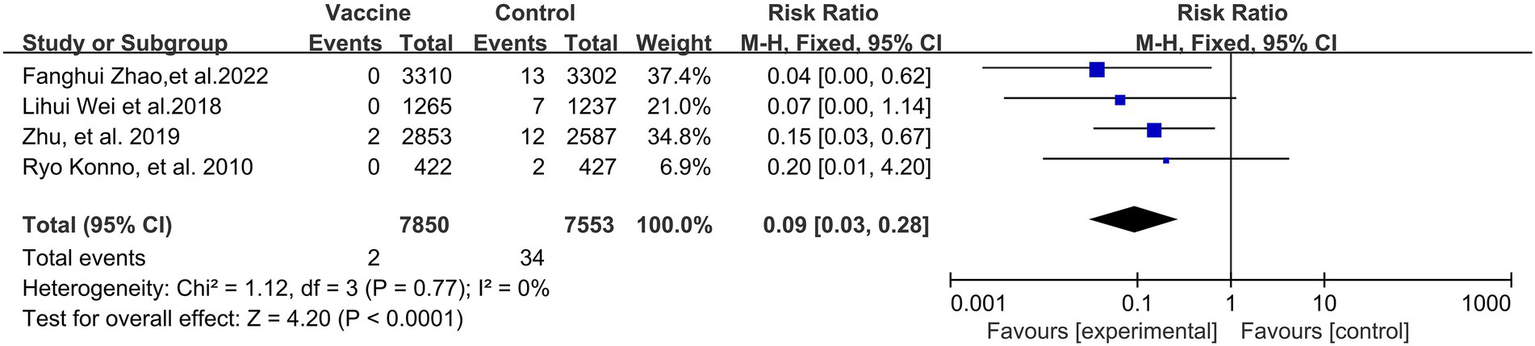 Although all studies claimed that exact randomized controlled procedures were performed, only seven studies specified how the random sequences were generated (Wu et al., 2015; Zhu et al., 2017, 2019; Mikamo et al., 2019; Wei et al., 2019; Qiao et al., 2020; Zhao et al., 2022). Furthermore, only five studies explained in detail how the process of allocating each participant into the vaccinated or control group was blinded (Wu et al., 2015; Zhu et al., 2017, 2019; Qiao et al., 2020; Zhao et al., 2022). Consequently, most studies (N = 5) failed in explaining how participants and researchers were blinded(Konno et al., 2010, 2014; Li et al., 2012; Wu et al., 2015; Wei et al., 2019) or how the outcome assessment process was blinded (N = 6) (Konno et al., 2010, 2014; Li et al., 2012; Wu et al., 2015; Wei et al., 2019; Qiao et al., 2020). One study presented incomplete outcomes (Wei et al., 2019; Figure 2).