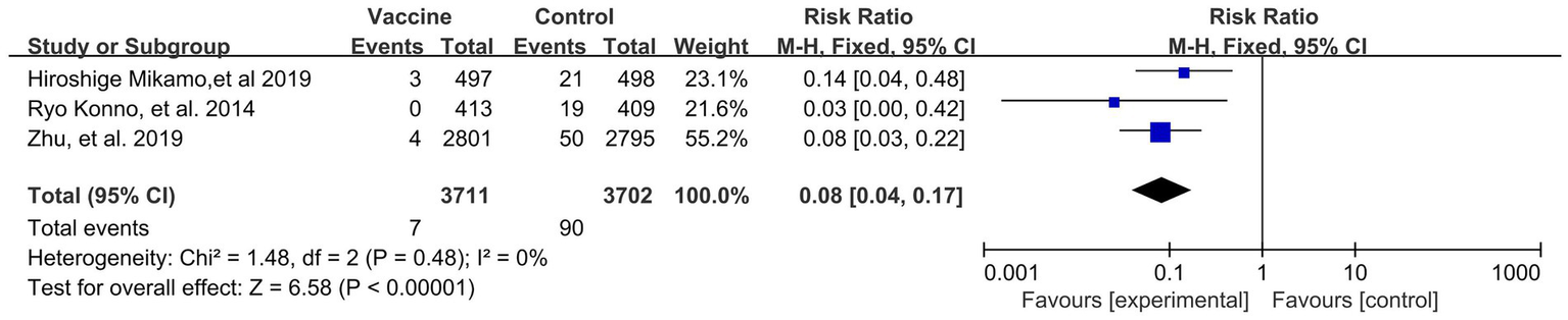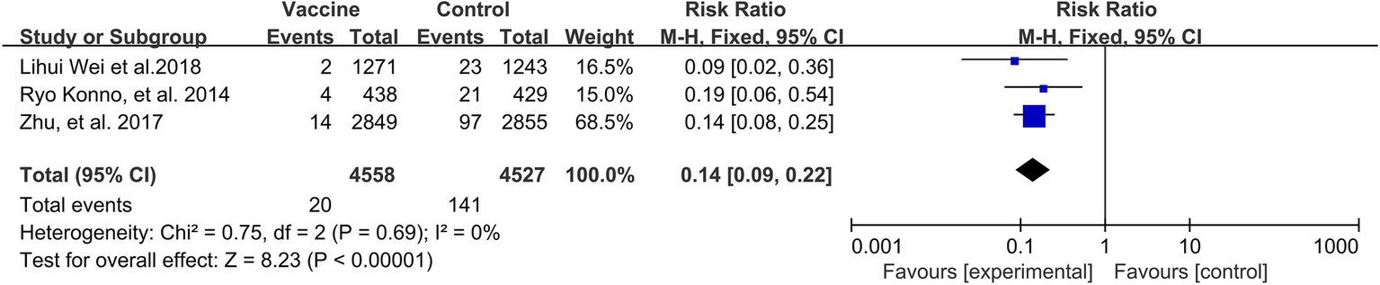 A preventive effect of HPV vaccination was observed on the incidence of ASC-US+ (3 RCTs: 9,085 participants; Figure 7), with a pooled RR of 0.14 (95% CI: 0.09–0.22). There was no significant heterogeneity among the studies (I2 = 0%; p = 0.69).