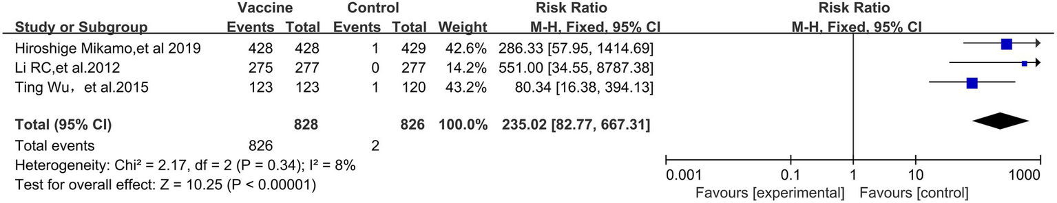 A preventive effect of HPV vaccination on HPV 16-specific immunogenicity (3 RCTs; 1,654 participants; Figure 8) was observed, with a pooled RR of 235.02 (95% CI: 82.77–667.31). No significant heterogeneity was observed among the studies (I2 of 8%, p = 0.34).