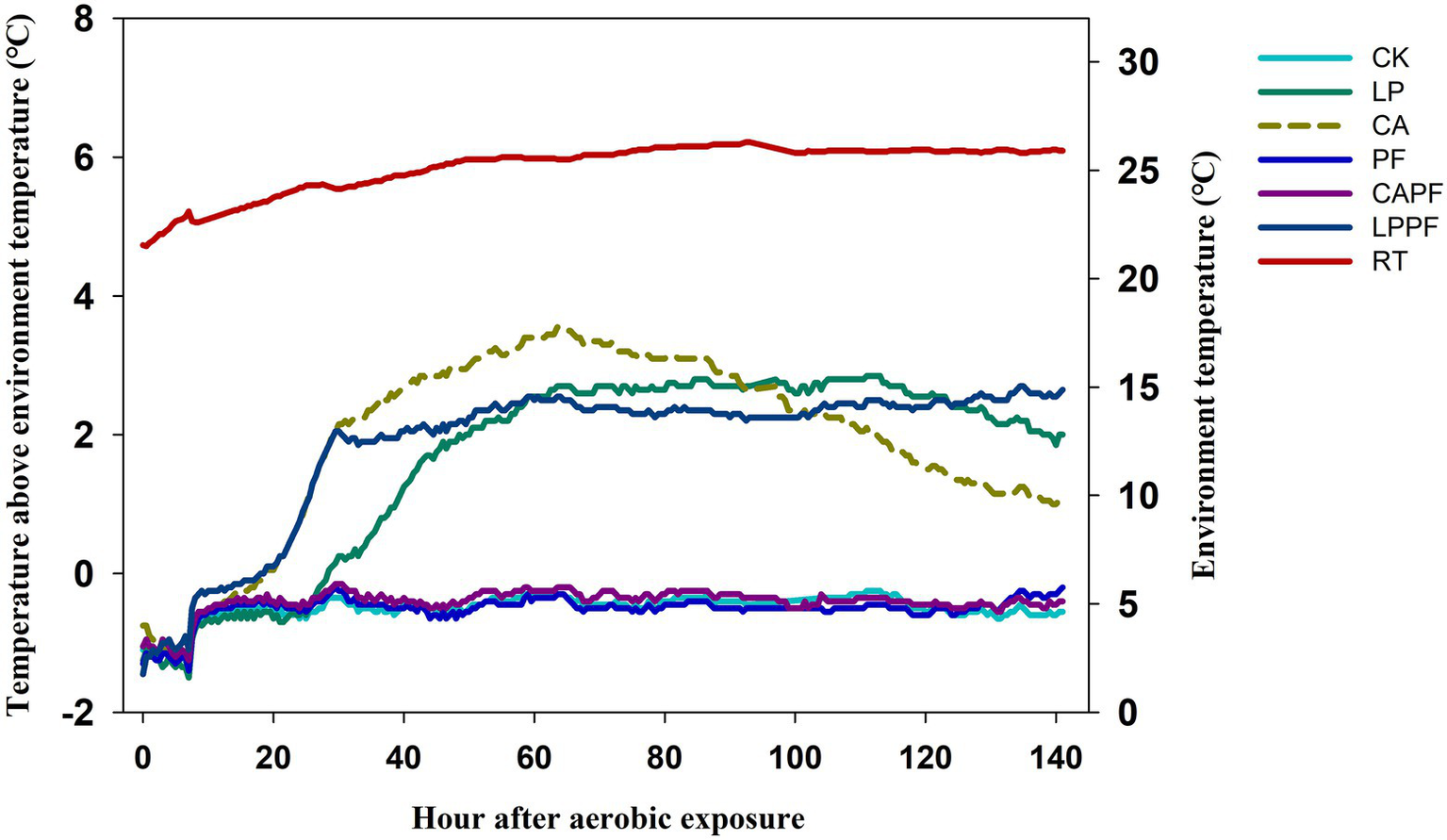 Temperature after aerobic exposure of forage oat silages treated additives. CK, control; LP, Lactobacillus plantarum a214; CA, citric acid; PF, purple perilla; LPPF, purple perilla + Lactobacillus plantarum a214; CAPF, purple perilla + citric acid; RT, room temperature.