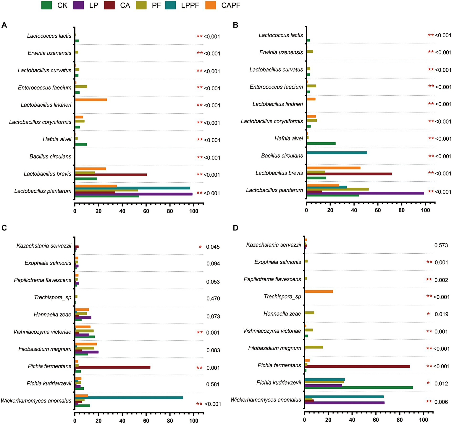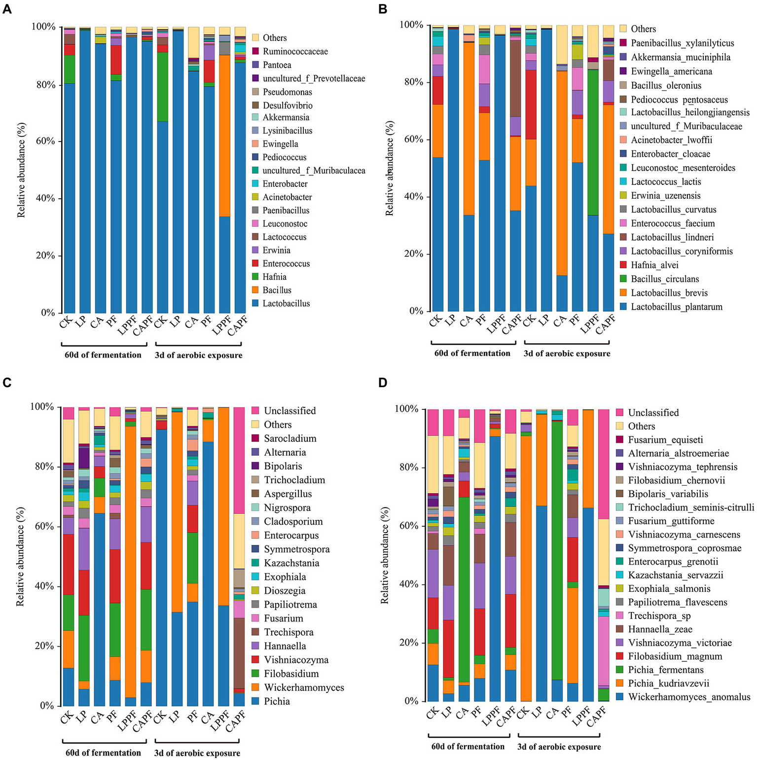 The fermentation end products and microbial numbers of oat silage after 60 days of ensiling and after exposure to air are shown in Table 2. There was an interaction (p < 0.01) between the effects of fermentation day and additive for pH because it was higher after 3 days of aerobic exposure than 60 days of ensiling for LP, CA, and LPPF treatments, but it was similar for CK, PF, and CAPF in both days. We also found an interaction (p < 0.01) between the application of additive and fermentation day for lactic acid because the contents of lactic acid in CK, CA, LP, and LPPF groups sharply decreased after exposure to air compared with 60 days of ensiling. In addition, treatments with CA and CAPF resulted in lower concentration of lactic acid compared with CK after 60 days of fermentation. The application of PF and CAPF caused a higher (p < 0.01) acetic acid concentration when compared with other treatment, and 60 days of ensiling was higher (p < 0.01) in acetic acid than exposure to air. The concentration of propionic acid was not affected by fermentation days (p = 0.742), but the application of purple peril (PF, LPPF, and CAPF) had a higher (p < 0.01) concentration of propionic acid than other treatments.