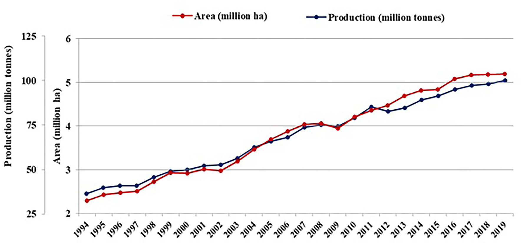 World status of onion on area harvested and production (Source: FAOSTAT, 2019).