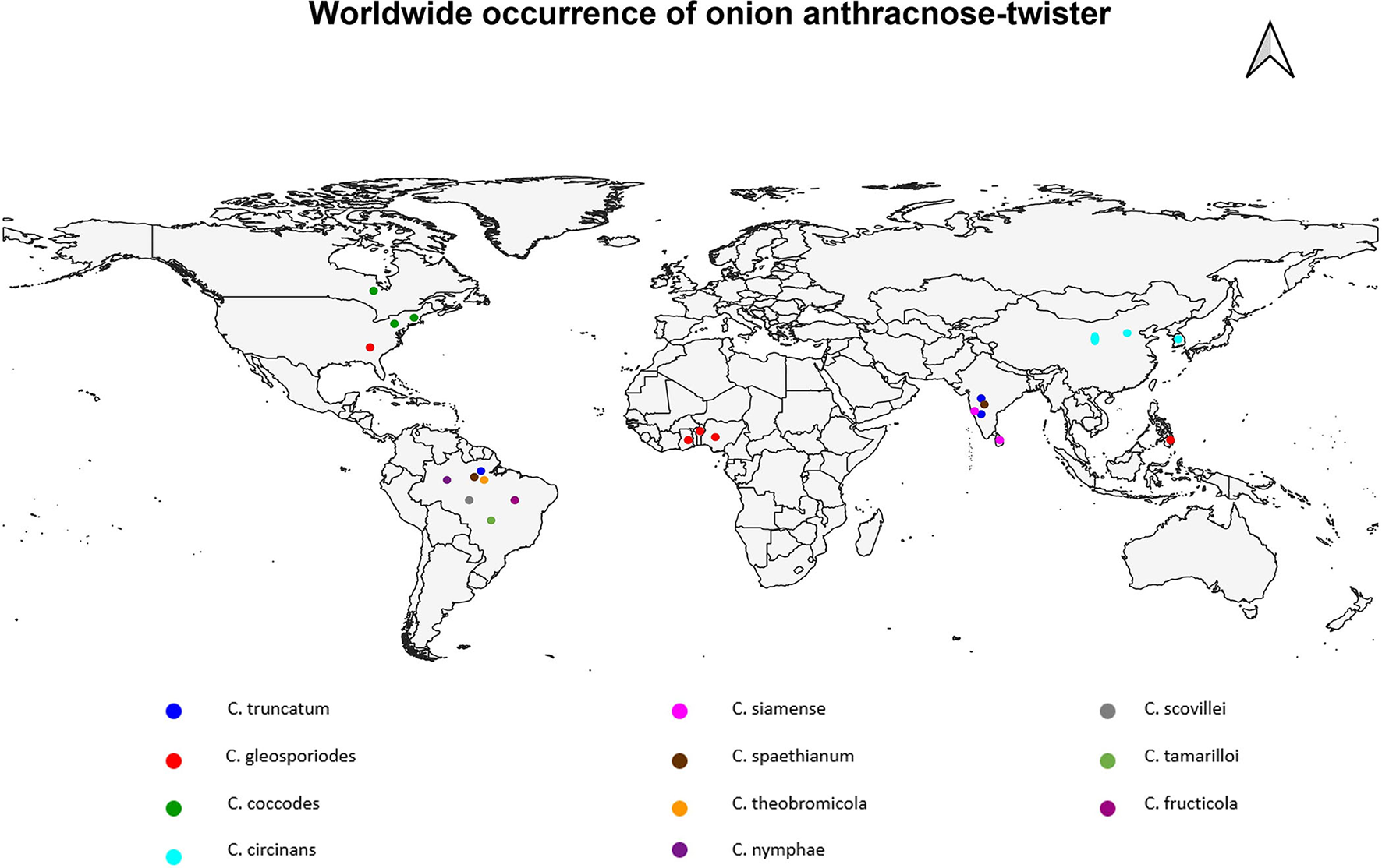 Earlier studies discovered that this disease is of major concern wherever onions are grown during the rainy or monsoon season (Ebenebe, 1980a; Qadri and Srivastava, 1985; Qadri, 1988; Singh and Sinha, 1994; Galvan et al., 1997; Weeraratne, 1997; Kuruppu, 1999; Alberto et al., 2001, 2002; Wiyono, 2007; Kim et al., 2008; Nischwitz et al., 2008; Sikirou et al., 2011; Rodriguez-Salamanca et al., 2012; Baysal-Gurel et al., 2014; Chowdappa et al., 2015; Santana et al., 2015). Figure 2 shows that anthracnose-twister disease is widespread throughout the world and occurs most regularly in the tropics and subtropics.