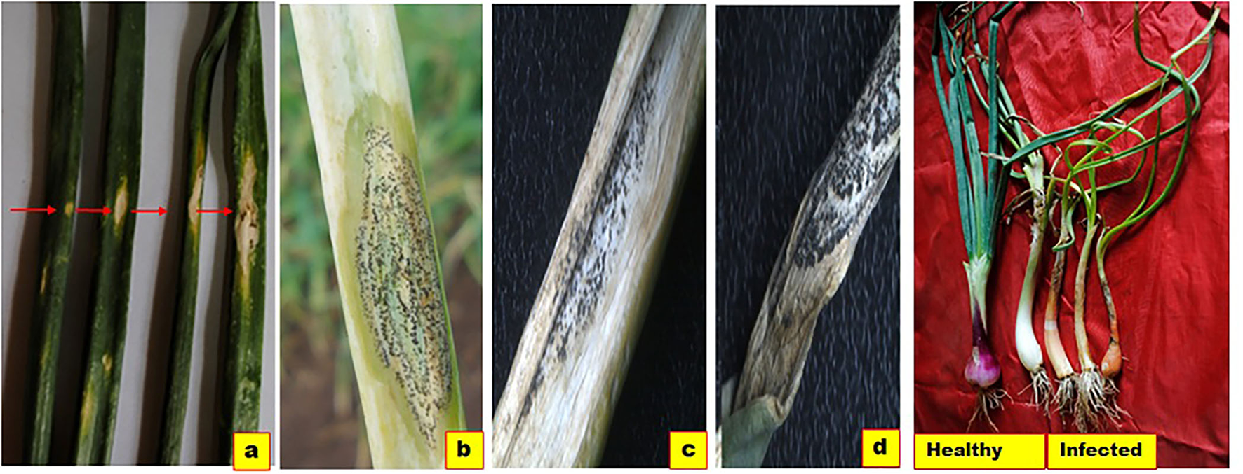 Symptoms of Anthracnose-Twister. (a) Initial white sunken lesions on leaves enlarges to form straw color patches surrounded by chlorotic margin. (b) Lesion advancement with formation of black color, fruiting bodies (acervuli). (c) Necrotic tissues covered with acervuli. (d) Leaf twisting and necrosis (d) seedling chlorosis, neck elongation and twisting with undersized bulbs. Red arrows indicate lesion enlargement.
