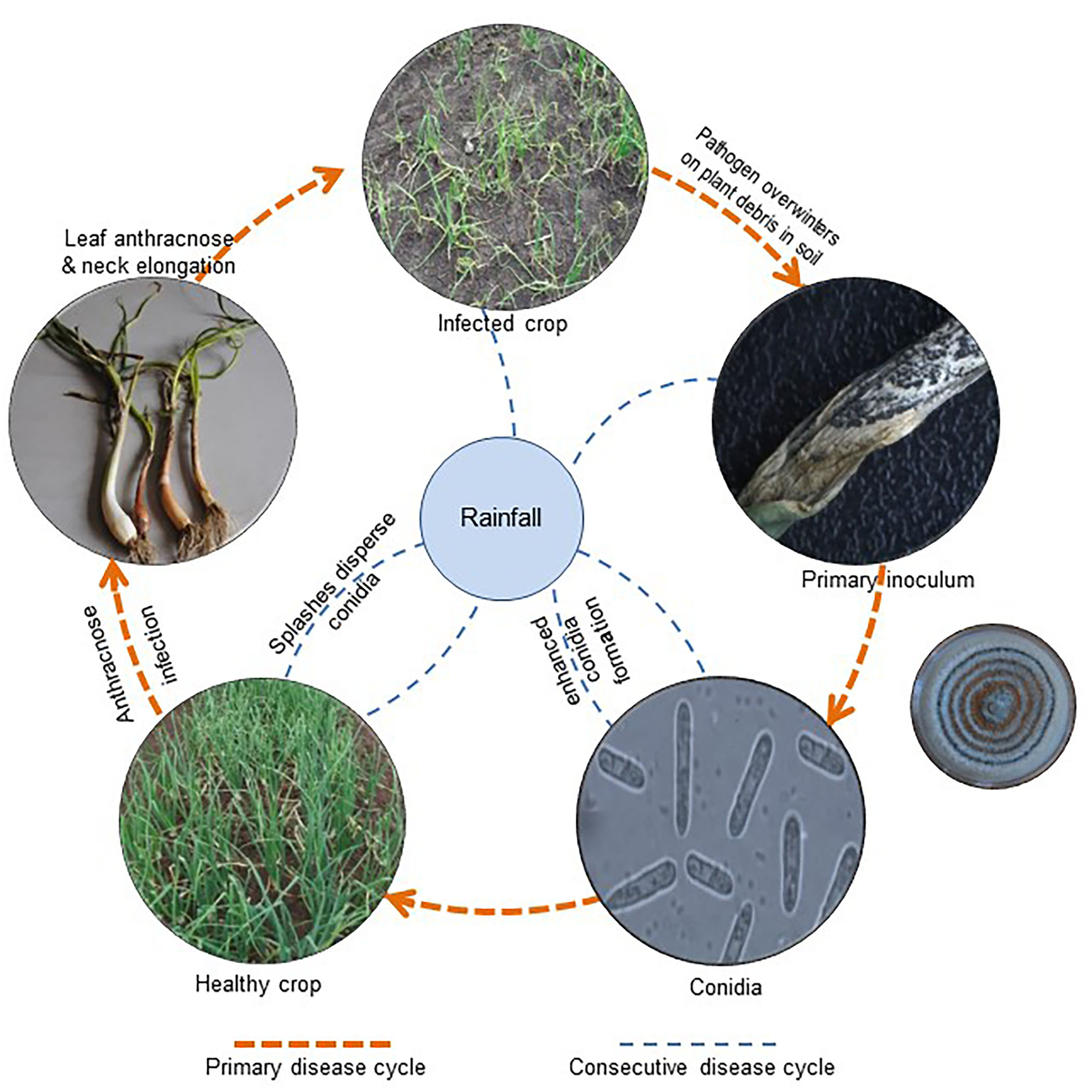 Moreover, the liberation and dispersal of conidia take place through a splash and wash-off mechanism (Rajasab and Chawda, 1994). Lower leaves receive conidial inoculum with rain splashes; hence, the maximum infected area was observed on the lower leaves. Later, conidia were transported by wash-off mechanism, along with rain splashes, to the upper leaves and were released from the leaves, moved downward, and deposited over the neck and bulbs where anthracnose symptoms develop. Since the conidial inoculum is distributed in several loci, the disease initially appears in patches and is equally distributed throughout the field (Ebenebe, 1980b).