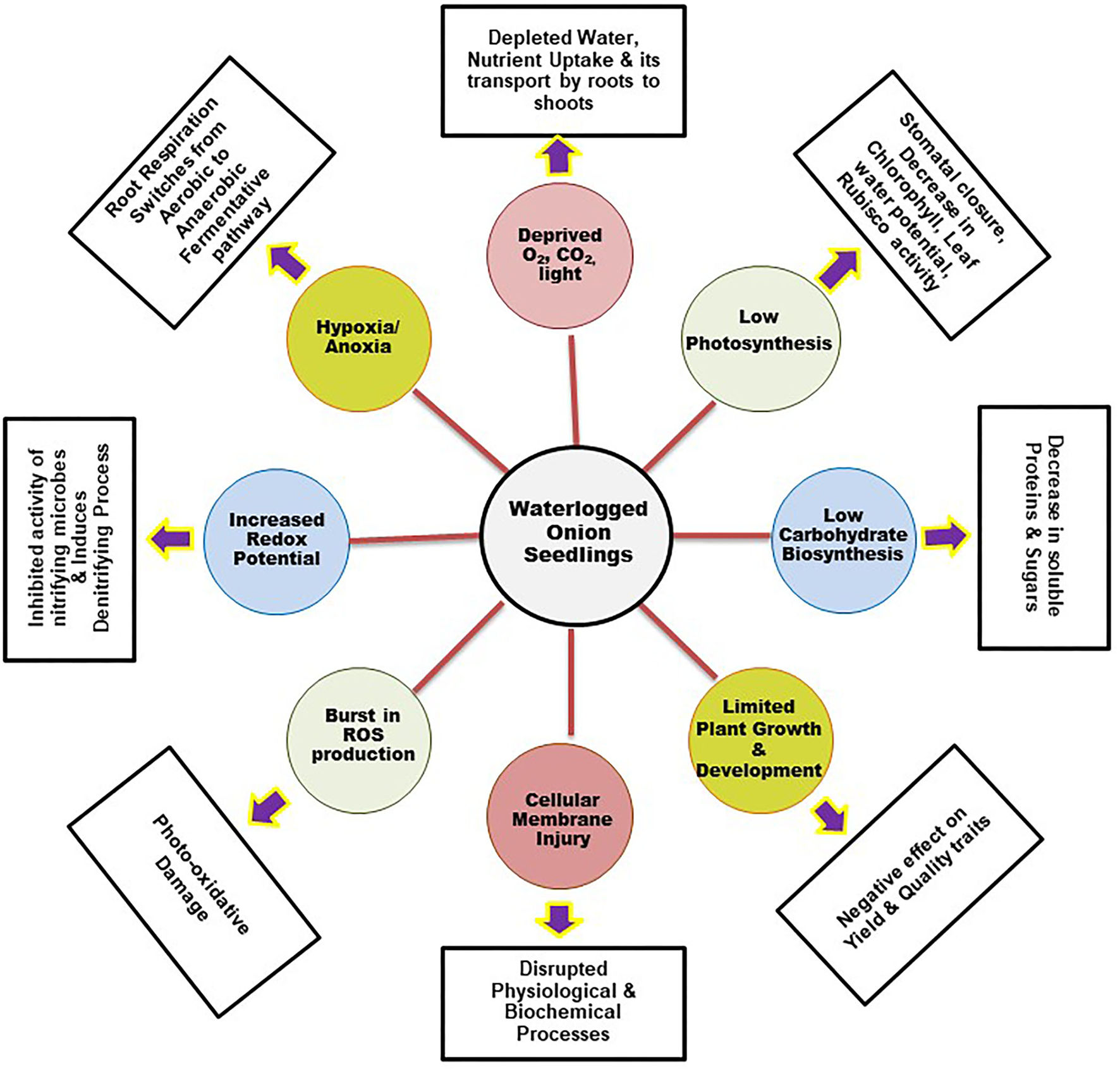 Soil flooding/waterlogging is a widespread, unavoidable seasonal phenomenon that limits onion production globally. The damage due to waterlogging is severe in onion crops because of their shallow root systems, where maximum root penetration is about 75 cm, with higher root density only in the topsoil layer (Drinkwater and Janes, 1955). It adversely affects plant growth and development both in the nursery and in a standing crop and, consequently, the yield potential of onions (Ghodke et al., 2018). It also limits plant growth by interfering with various physiological and biochemical processes regulated by a network of genes and plant hormones (Figure 5). Its impact is complex and varies according to the variety, season, soil type, growth stage, extent, and rainfall duration.