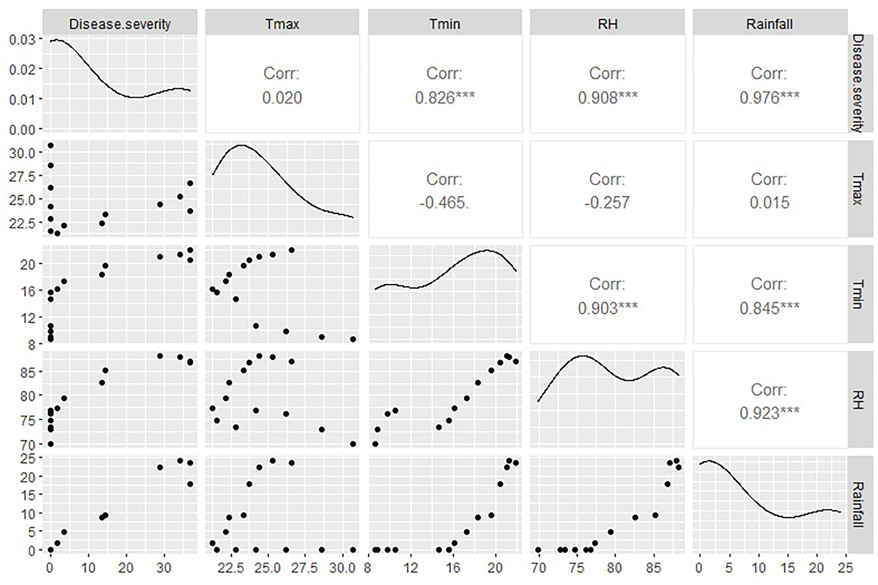 Anthracnose disease severity in relation to weather parameters (rainfall, humidity, temperature) during 2012-13 at ICAR-DOGR. ***Highly significant at < 0.001.