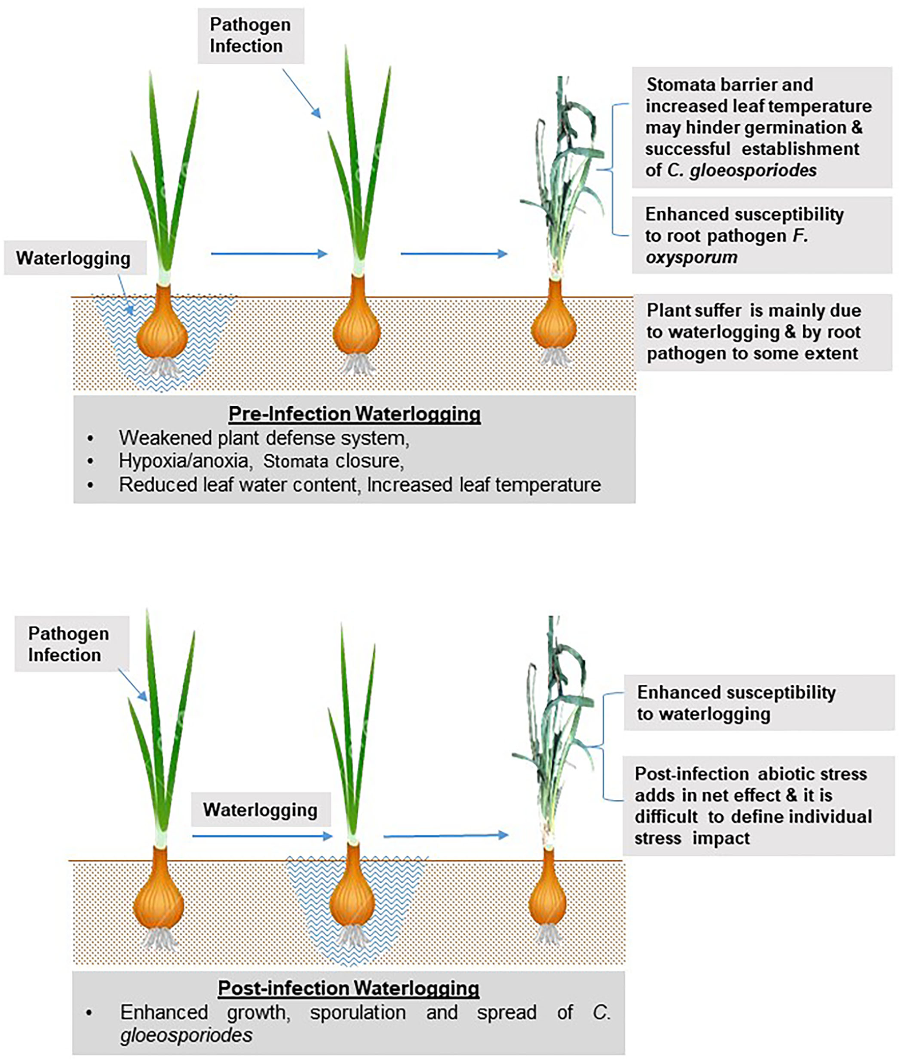 Additionally, many plants close their stomata in response to waterlogging. Thus, in such situations, initial establishment and host penetration by the foliar pathogens may become difficult, reducing the possibility of anthracnose infection. However, under this condition, a possible increase in root infection may give a twister appearance to onion (Shivas et al., 1995; Alberto and Aquino, 2010; Alberto, 2014). In contrast, if the foliar infection by C. gloeosporiodes has already been established in the host and later the host is exposed to waterlogging, chances of enhanced growth, sporulation, and the spread of foliar pathogen may increase (Figure 7).