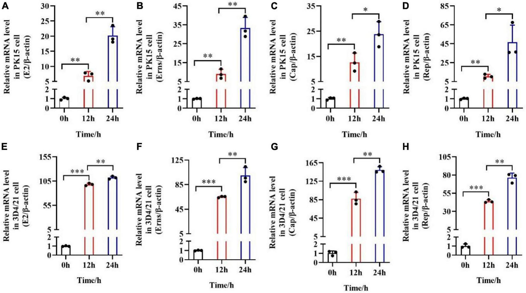 mRNA expression levels of E2, Erns, Cap, and Rep in vitro after the transfection of pSCA1-E2-Erns-Cap-Rep. (A–D) The mRNA level of E2, Erns, Cap, and Rep was normalized based on β-actin expression in PK15 cells, respectively. (E–H) The mRNA level of E2, Erns, Cap, and Rep was normalized based on β-actin expression in 3D4/21 macrophage cells, respectively. Three independent qPCR experiments always obtained consistent conclusion, and one of the results was shown. * denotes the significant difference between different groups (*P < 0.05, **P < 0.01, and ***P < 0.001).