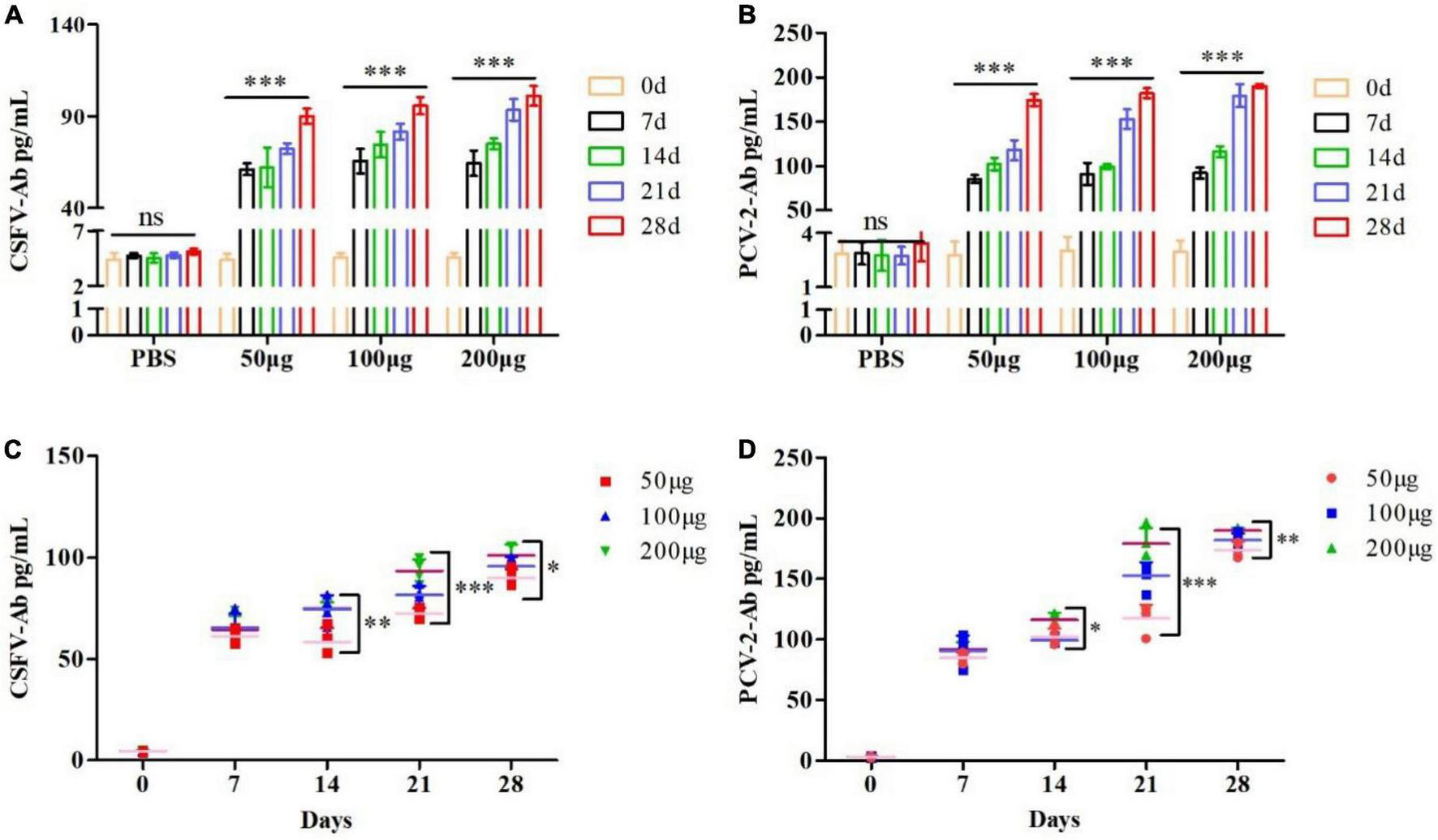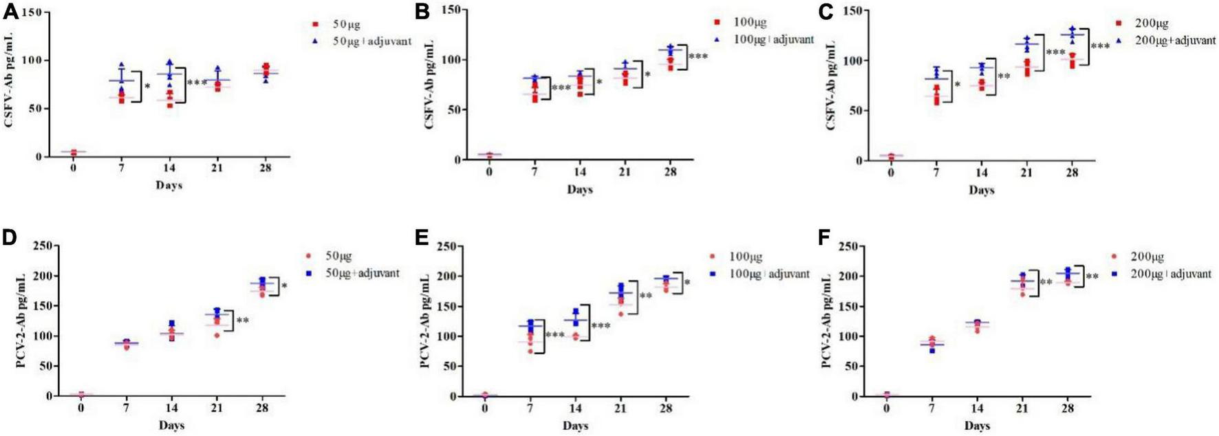 The serum was obtained from the saline, 50 μg, 100 μg, 200 μg, 50 μg + adjuvant, 100 μg + adjuvant, and 200 μg + adjuvant groups at 0, 7, 14, 21, and 28 dpi, respectively. The levels of CSFV antibody and PCV2 antibody were measured using ELISA kits according to the manufacturer’s instructions, which were analyzed through the GraphPad prism 5.0 software (MSK Bio, Wuhan, China) (Karki et al., 2021).