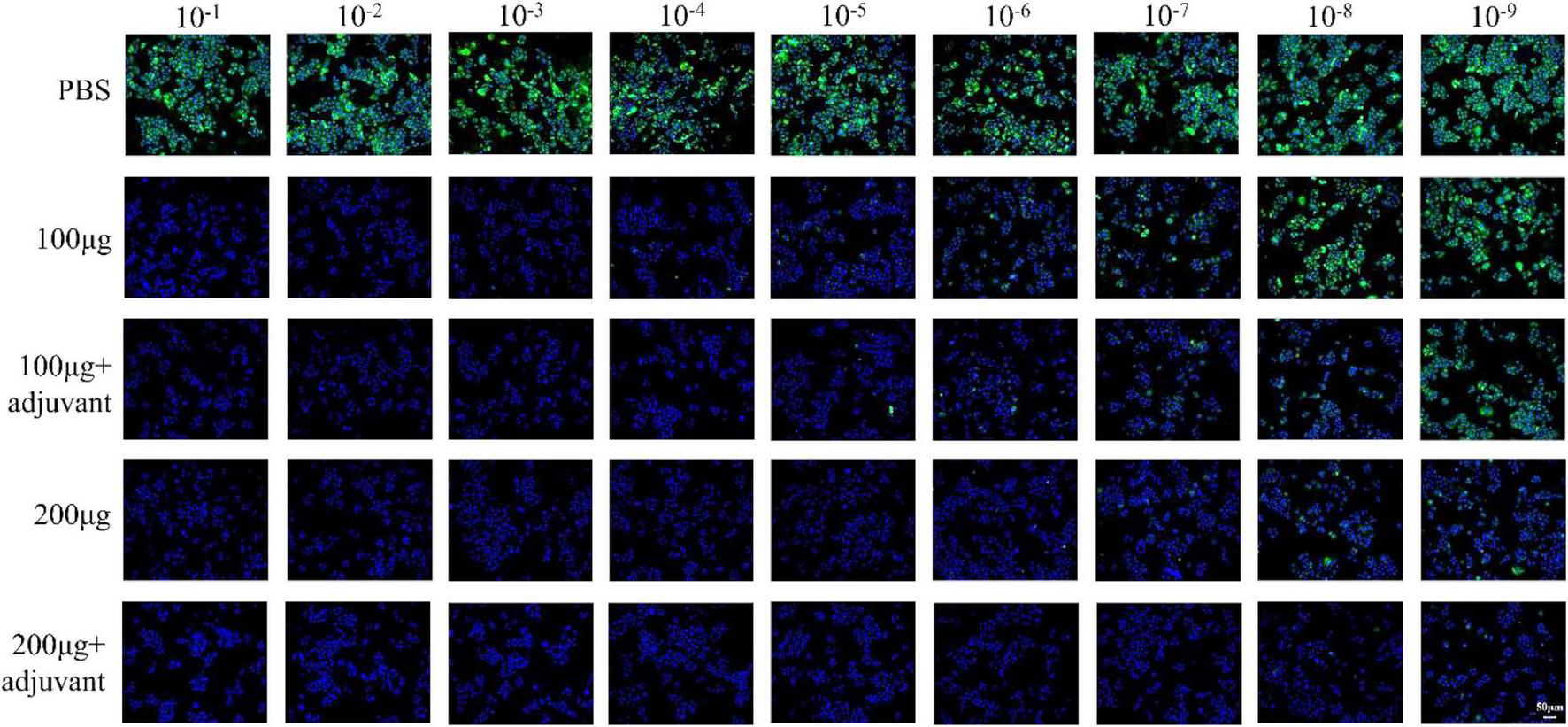 Serum samples obtained above (saline, 100 μg, 200 μg, 100 μg + adjuvant group, and 200 μg + adjuvant group) were heat inactivated for 30 min at 56°C and serially diluted two-fold (initial dilution concentration was 1:8) with three replicates for each concentration hole. Each diluted serum (50 μL) was mixed with 50 μL of 100 TCID50 CSFV, and the mixture was incubated at 37°C for 1 h. Subsequently, the single-layer PK15 cells (5 × 103 cells per well) were infected using 100 μL of serum/serum mixtures, and the 96-well plate was incubated at 37°C and 5% CO2 atmosphere for about 5 days. Cells were fixed in 4% paraformaldehyde for 20 min after 5-day incubation and were then permeabilized with 0.3% Triton X-100 for 20 min at room temperature and blocked with 5% bovine serum albumin (BSA) for 1 h at 37°C. Subsequently, cells were incubated with CSFV anti-E2 protein antibody (diluted 1:500 in BSA) for 12 h at 4°C. The fixed cells were incubated with fluorescein isothiocyanate (FITC)-conjugated goat anti-rabbit (1:400 dilution, BioLegend) for 1 h at 37°C after washing three times using PBST. Cells were visualized using a fluorescence microscope (Leica) after nuclei staining with 4′,6-diamidino-2-phenylindole (DAPI) for 15 min at room temperature. Neutralizing antibody titers were determined as serum dilutions that fully protect 50% of cells from infection.