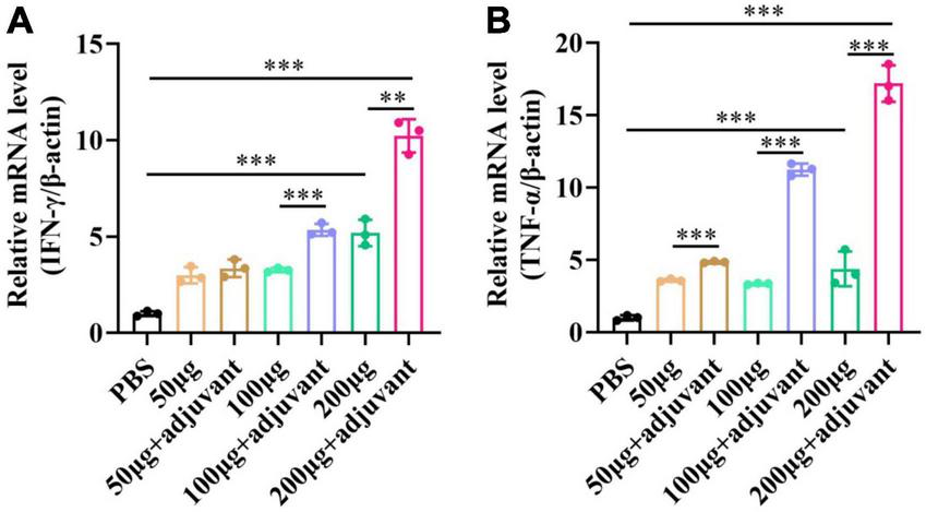 After the immunization of the pSCA1-E2-Erns-Cap-Rep plasmid vaccine or PBS for 28 days, spleens were obtained from the PBS, 50 μg, 100 μg, 200 μg, 50 μg + adjuvant, 100 μg + adjuvant, and 200 μg + adjuvant groups, respectively. Subsequently, spleens were tested for the level of IFN-γ and TNF-α mRNA expression. The primers are shown in Table 1. RNA was reverse-transcribed using PrimeScript™ RT reagent Kit (TAKARA). The transcription level of IFN-γ and TNF-α in spleens of mice after immunization was measured through the RT-PCR method using SuperReal PreMix Plus (SYBR Green) kit according to the manufacturer’s instructions, which were analyzed through 2–ΔΔCT method.