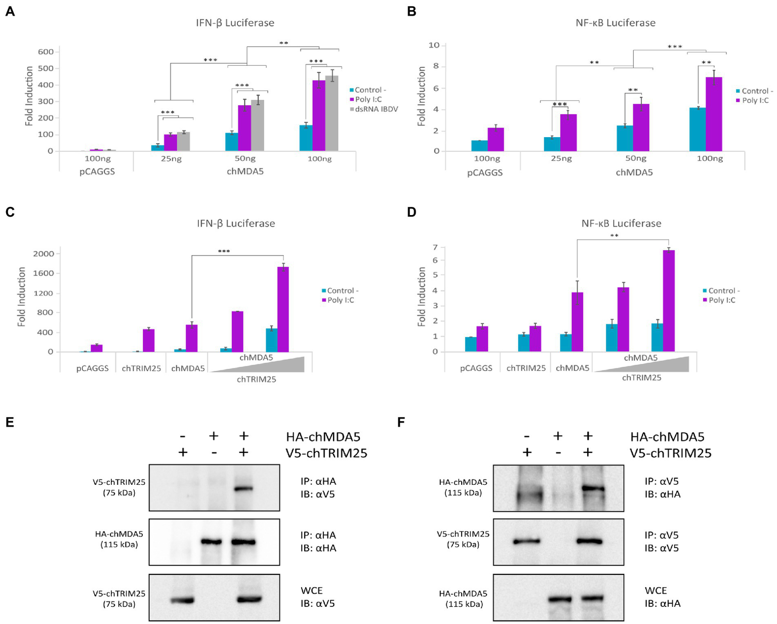 chTRIM25 is involved in chMDA5-mediated innate immune response. (A) DF-1 cells were co-transfected with different amounts (25, 50 or 100 ng) of HA-chMDA5 Full expression vector together with plasmids pLucter, carrying the firefly luciferase gene under the IFN-β promoter (100 ng), and pR-null, harboring the Renilla luciferase gene (30 ng). At 8 h pt, cultures were either mock transfected (control) or transfected with IBDV dsRNA (100 ng) or synthetic dsRNA (Poly I:C; 100 ng), and harvested 24 h after plasmid transfection. (B) DF-1 cells were co-transfected with different amounts of HA-chMDA5 Full expression vector as above together with the plasmid carrying the firefly luciferase gene under the NF-κB promoter (pSI-chNFκB-Luc; 50 ng). At 8 h pt, the cells were transfected with 250 ng of synthetic dsRNA (Poly I:C). Cultures were harvested 24 h after plasmid transfection. (C) DF-1 cells were transfected with pLucter (100 ng) and pR-null (30 ng) in combination with the plasmids expressing either V5-chTRIM25 (25 ng), HA-chMDA5 Full (25 ng), or a combination of the HA-chMDA5 Full (25 ng) plasmid with two amounts (25 or 50 ng) of the V5-chTRIM25 expression plasmid. At 8 h pt the cells were transfected with 250 ng of synthetic dsRNA (Poly I:C). Cultures were harvested 24 h after plasmid transfection. (D) DF-1 cells were transfected with pSI-chNFκB-Luc (50 ng) in combination with plasmids expressing either V5-chTRIM25 (25 ng), HA-chMDA5 Full (25 ng), or a combination of the HA-chMDA5 Full (25 ng) plasmid with two amounts (25 or 50 ng) of the chTRIM25 expression plasmid. At 8 h pt, the cells were transfected with 250 ng of synthetic dsRNA (Poly I:C). Cultures were harvested 24 h after plasmid transfection. A control consisting of cultures co-transfected with pLucter, pR-null, and the empty pCAGGS plasmid (100 ng) or with the pSI-chNFκB-Luc and empty pCAGGS plasmid (100 ng) was included in each assay. Cell extracts were analyzed using the dual luciferase assay kit, and each determination was carried out in duplicate. The firefly luciferase expression level of each sample was normalized using Renilla values. Bars indicate means ± standard derivations based on data of duplicate samples from three independent experiments. ** and *** indicate p values of <0.01 and < 0.001, respectively, as determined by unpaired Student’s test. (E,F) DF-1 cells were co-transfected with HA-chMDA5 Full and V5-chTRIM25 plasmids. At 24 h pt the cells were harvested and used for immunoprecipitation (IP) assays using specific antibodies against HA (E) or V5 (F), followed by immnunoblotting (IB) with anti-V5 and anti-HA antibodies, respectively. Whole cell extracts (WCE) were analyzed by IB with anti-V5 (E) and anti-HA (F) antibodies, respectively.