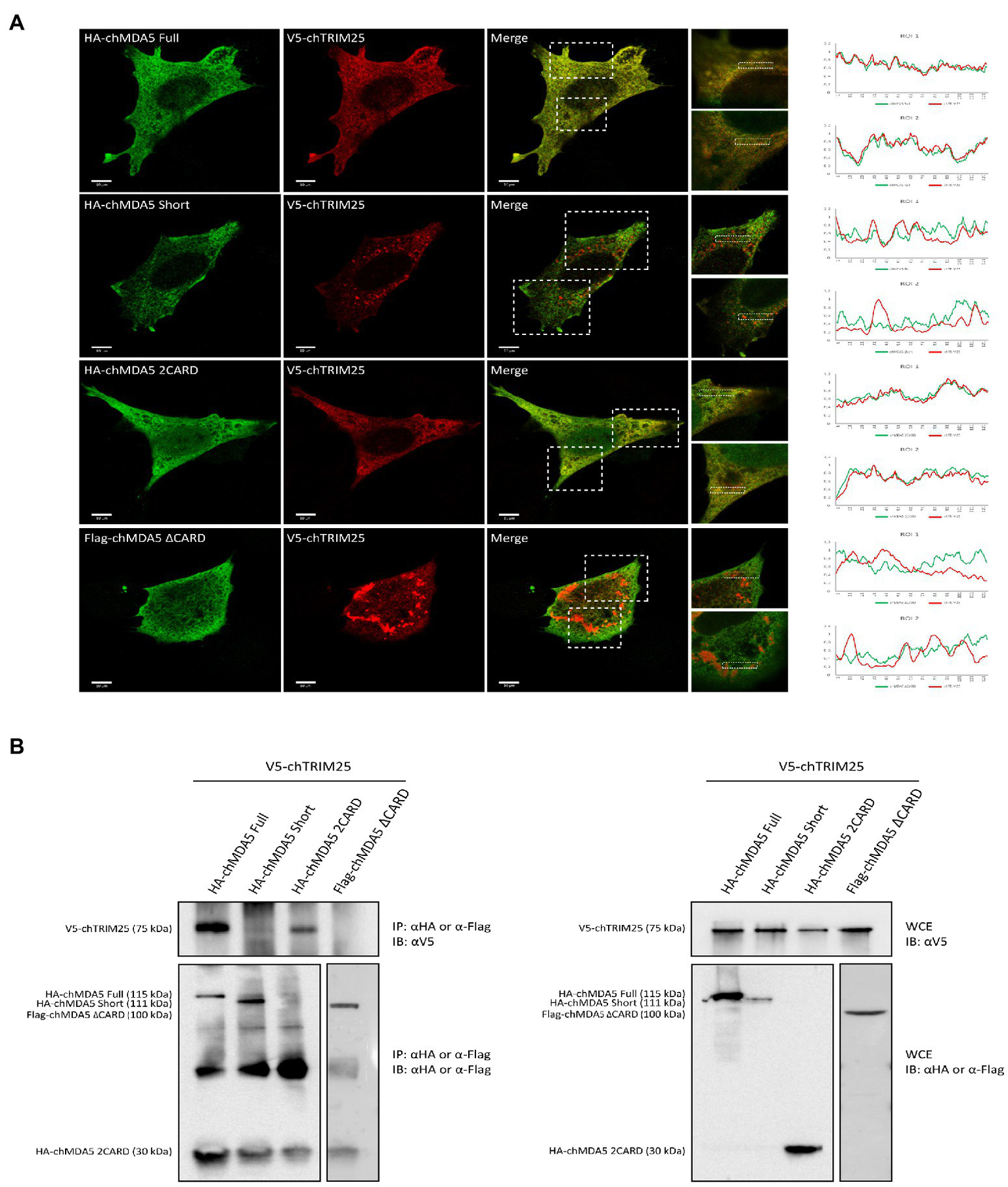 The CARD domains of MDA5 interact with TRIM25 in chicken cells. (A) DF-1 cells grown in glass coverslips were co-transfected with V5-chTRIM25 and HA-chMDA5 Full, HA-chMDA5 Short, HA-chMDA5 2CARD or Flag-chMDA5 ∆CARD versions. At 24 h pt, the cells were fixed with 4% paraformaldehyde and processed for immunofluorescence using antibodies against HA (Green), Flag (Green) and V5 (Red). Images were acquired with Leica TSC SP8 confocal laser with STED module for super-resolution. Insets show higher magnifications (x3) of boxed areas. The graphs at the right are histograms of the intensity of fluorescence profiles measured along the dashed line in the zoom. (B) Cells grown in regular 6-well plates were transfected as described above and harvested at 24 h pt. Collected cells were processed for immunoprecipitation (IP) using specific antibodies against HA or Flag followed by immunoblotting (IB) with anti-V5 antibodies (left panel). Whole cell extracts (WCE) were also analyzed by immunoblotting with specific antibodies against V5, HA or Flag.