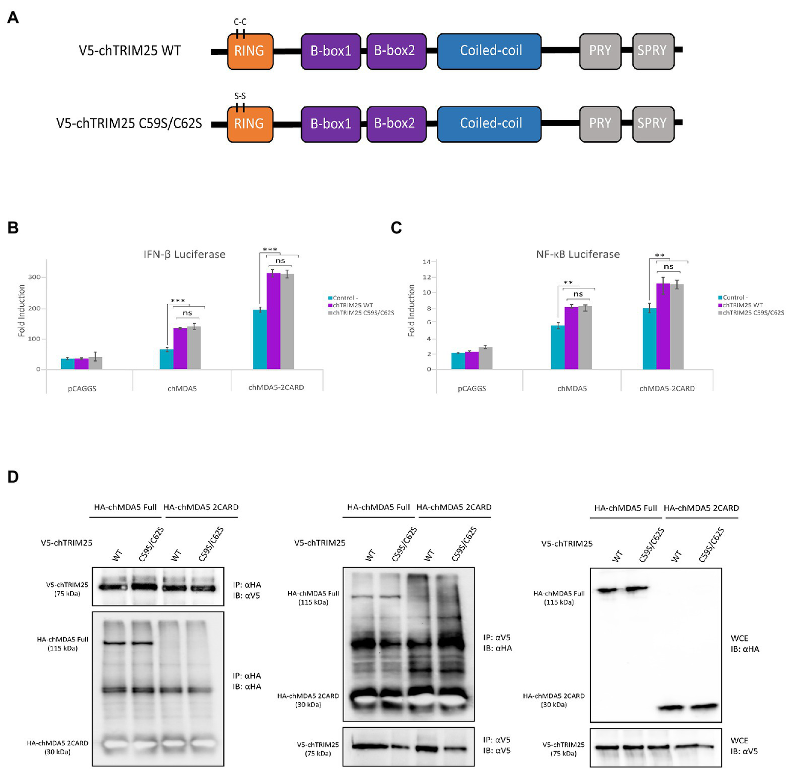 The E3-ubiquitin ligase function of chTRIM25 is neither required for IFN-β and NF-κB promoter activation nor for the interaction with chMDA5. (A) Schematic representation of the wild-type and the C59S/C62S mutant chTRIM25 proteins. (B,C) DF-1 cultures were co-transfected with HA-chMDA5 Full (25 ng) or HA-chMDA2 2CARD (10 ng) expression vectors together with plasmids expressing either the wild-type or the C59S/C62S mutant chTRIM25 proteins (25 ng), or with the empty pCAGGS plasmid, in combination with (B) pLucter and pR-null, or (C) pSI-chNFκB-Luc. At 8 h pt. the cells were transfected with 250 ng of synthetic dsRNA (Poly I:C). Cultures were harvested 24 h after plasmid transfection. A control consisting in cells co-transfected with pLucter, pR-null and the empty pCAGGS plasmid (50 ng) or with the pSI-chNFκB-Luc and the empty pCAGGS plasmid (50 ng) was included in each assay. Samples were analyzed using the dual luciferase assay kit, and each determination was carried out in duplicate. The firefly luciferase expression level of each sample was normalized using Renilla values. Bars indicate means ± standard derivations based on data for duplicate samples from three independent experiments. ** and *** indicate p values of <0.01 and < 0.001, respectively, as determined by unpaired Student’s test. ns, not significant. (D) DF-1 cells were co-transfected with either V5-chTRIM25 or V5-chTRIM25 C59S/C62S plasmids in combination with HA-chMDA5 Full or HA-chMDA5 2CARD. At 24 h pt the cells were collected and processed for immunoprecipitation (IP) using specific antibodies against HA followed by immunoblotting (IB) with anti-V5 and anti-HA antibodies (left panel), or immunoprecipitation with antibodies against V5 followed by immunoblotting with anti-HA and anti-V5 antibodies (middle panel). Whole cell extracts (WCE) were also analyzed by immunoblotting with specific antibodies against HA or V5 (right panel).
