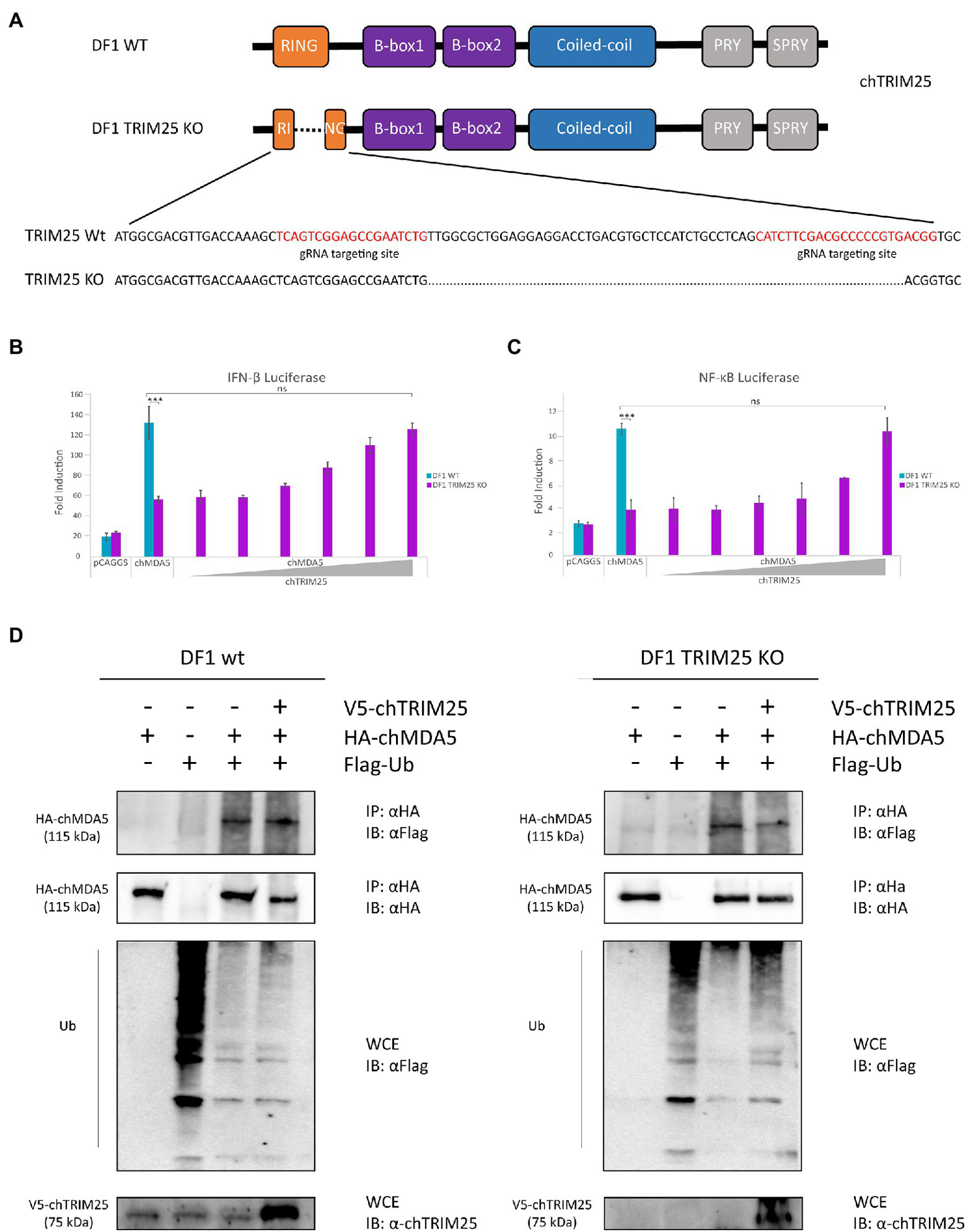 Because chTRIM25 interacts with chMDA5, and this interaction seems important for activation of MDA5 signaling, we investigated how chTRIM25 promotes chMDA5 activation. Although, as just mentioned, our results suggested that the ubiquitinating role of chTRIM25 was not required to regulate chMDA5-mediated signaling, we wished to further confirm these findings using the DF-1 TRIM25 KO cell line. For this, wild-type DF-1 and DF-1 TRIM25 KO cells were co-transfected with plasmids expressing chMDA5 Full, Flag-Ubiquitin (Flag-Ub) and chTRIM25. 24 h later, cells were harvested and used for co-immunoprecipitation assays. As shown in Figure 5D, chMDA5 was similarly ubiquitinated in both cells lines. Moreover, overexpression of chTRIM25 did not increase the ubiquitination of the exogenously expressed chMDA5 in these cell lines. These results indicate that chMDA5 undergoes a robust ubiquitination, and that this modification is not mediated by chTRIM25.