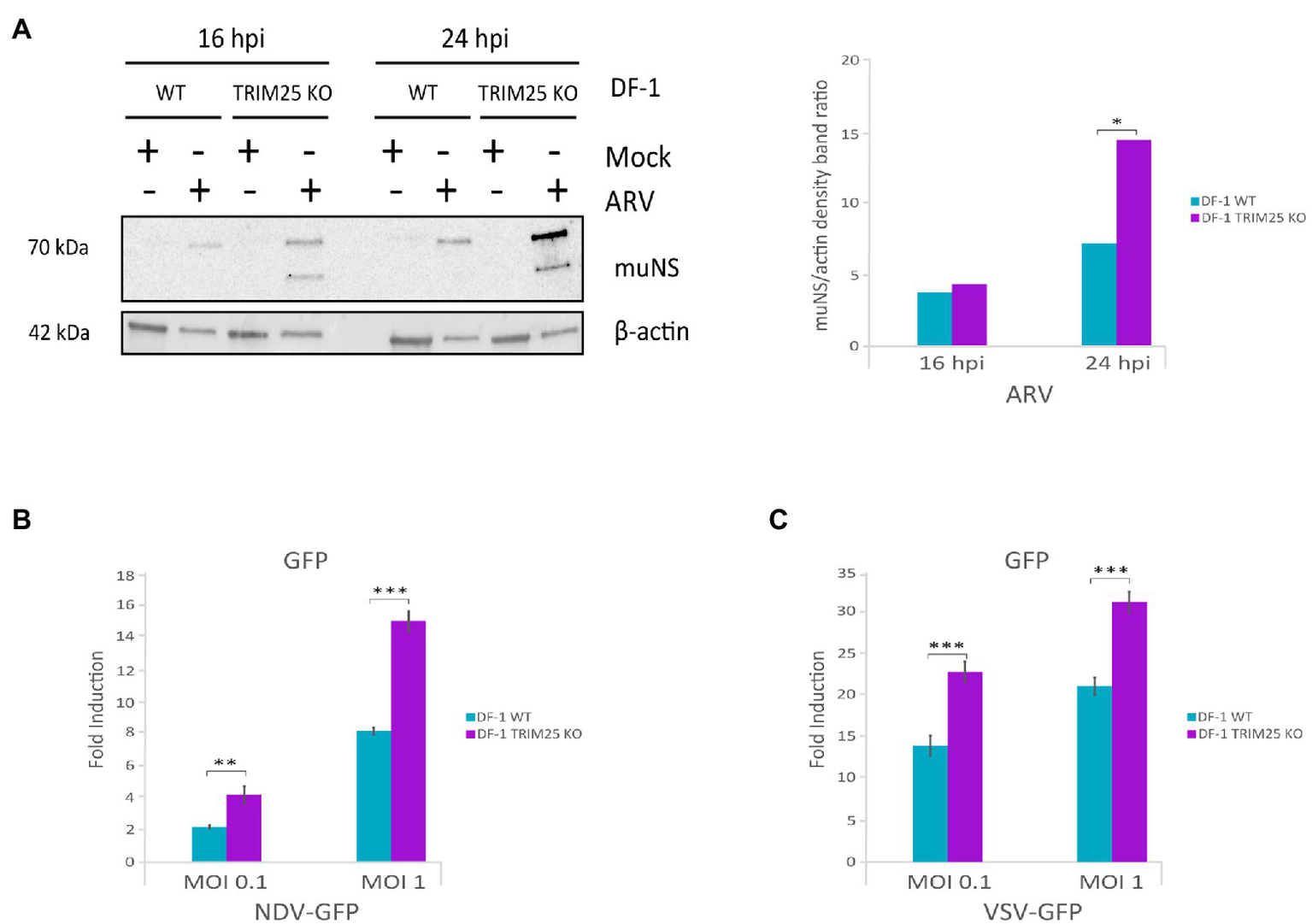 The enhancement of IBDV replication upon chTRIM25 knockout is consistent with data showing the involvement of chTRIM25 on the upregulation of the MDA5-mediated innate immune response. Thus, it was interesting to investigate the potential role of chTRIM25 on the control of other viral infections. For this, we challenged wild-type DF-1 and DF-1 TRIM25 KO cells with another double-stranded RNA virus, i.e., avian reovirus (ARV), and two single-stranded RNA viruses, namely NDV and VSV. DF-1 cells were infected with ARV at a MOI of 2 PFU/cell, and at 16 and 24 h pi cells were collected for Western blot analysis using an antibody against the muNS protein. As shown in Figure 7A higher accumulation of both isosforms of the protein was observed in DF-1 TRIM25 KO cells when compared to wild-type DF-1 cells, at both pi times. For NDV and VSV infections, we used NDV-GFP and VSV-GFP recombinant viruses and infections were performed at MOIs of 0.1 and 1 PFU/cell and cells were harvested at 24 h pi. GPF levels, used as readout of virus replication, were significantly higher in DF-1 TRIM25 KO infected with either dose of NDV-GFP (Figure 7B) or VSV-GFP (Figure 7C) than those obtained in wild-type DF-1 cells. We then wished to determine whether the increase of viral replication in the DF-1 TRIM25 KO cells correlates with an attenuation of the innate immune response. However, RT-qPCR results showed very low IFN-β, Mx, OAS and PKR expression levels at the analyzed time pi in both wild-type and TRIM25 KO DF-1 cell lines infected with either NDV-GFP or VSV-GFP. Nonetheless, these results indeed indicate that abrogation of chTRIM25 expression results in higher permissiveness to viral replication.