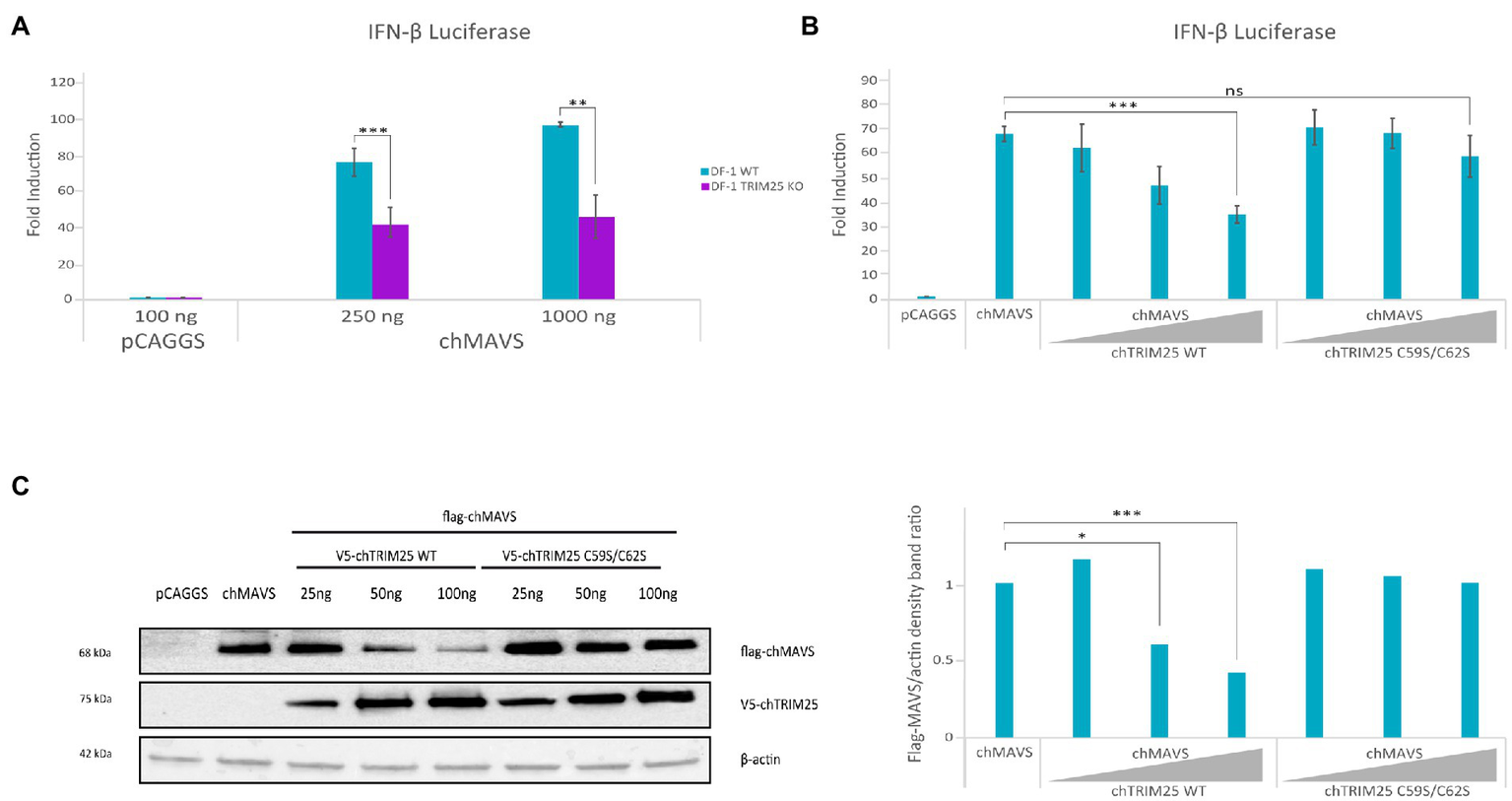 To carry out this study we used IFN-β and NF-ĸB reporter assays in DF-1 cells co-transfected with chMDA5 Full or chMDA5 2CARD in combination with wild-type chTRIM25 or chTRIM25 C59S/C62S. The activation of both, IFN-β and NF-ĸB promoters through the MDA5-or MDA5 2CARD-mediated signaling pathway observed in cells co-transfected with the mutant chTRIM25 C59S/C62S were similar to those detected in cells transfected with wild-type chTRIM25 (Figures 4B,C). This result suggests that the E3-ubiquitin ligase activity of chTRIM25 is not required for its downstream IFN-β and NF-ĸB activating function.
