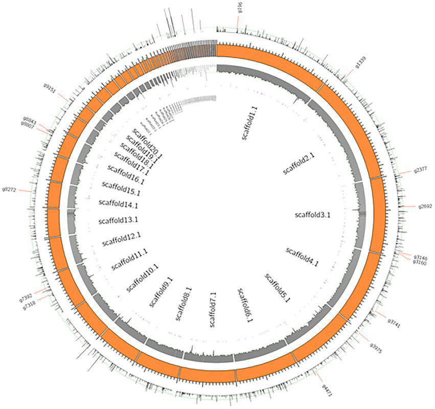 The genome of PO212 was sequenced via paired-end Illumina MiSeq technology, providing two DNA-seq libraries: one paired-end small fragment library and a second obtained from long-range DNA fragments. The resulting assembly was performed de novo and evaluated in terms of N50 and L50 using Quast. Automated assembly and manual sequence verification yielded an estimated PO212 genome size of 29.82 Mb at ~200× coverage. PO212 genome was organized into 65 scaffolds with an N50 scaffold length of 1.88 Mb, comprising the first six longest scaffolds and reaching an N90 scaffold length of 0.38 Mb, corresponding to the first 18 scaffolds (Table 4 and Supplementary Table S1). PO212 genome had a GC content of 49.07%, similar to that of other Penicillium genomes. After the manual curation of automated ORF predictions by AUGUSTUS, we determined at least 10,164 ORFs in the PO212 genome.