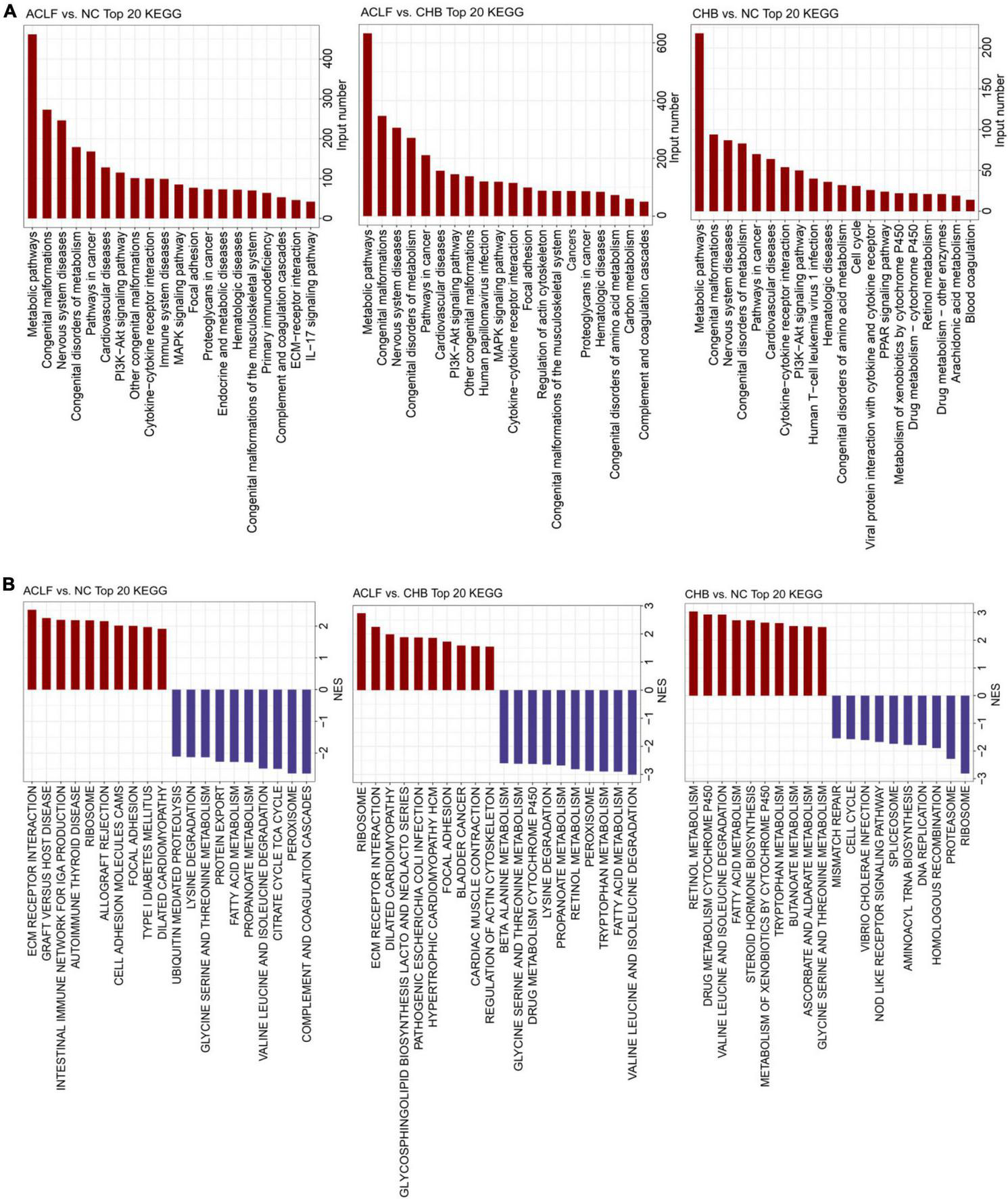 Functional alterations during acute-on-chronic liver failure (ACLF) development. (A) Bar chart of KEGG pathway enrichment analysis of the DEGs showing the top 20 enriched KEGG pathways. (B) Twenty significantly upregulated and downregulated biological processes were identified using GSEA in pairwise comparisons among the three groups. KEGG, Kyoto Encyclopedia of Genes and Genomes; GSEA, gene set enrichment analysis.