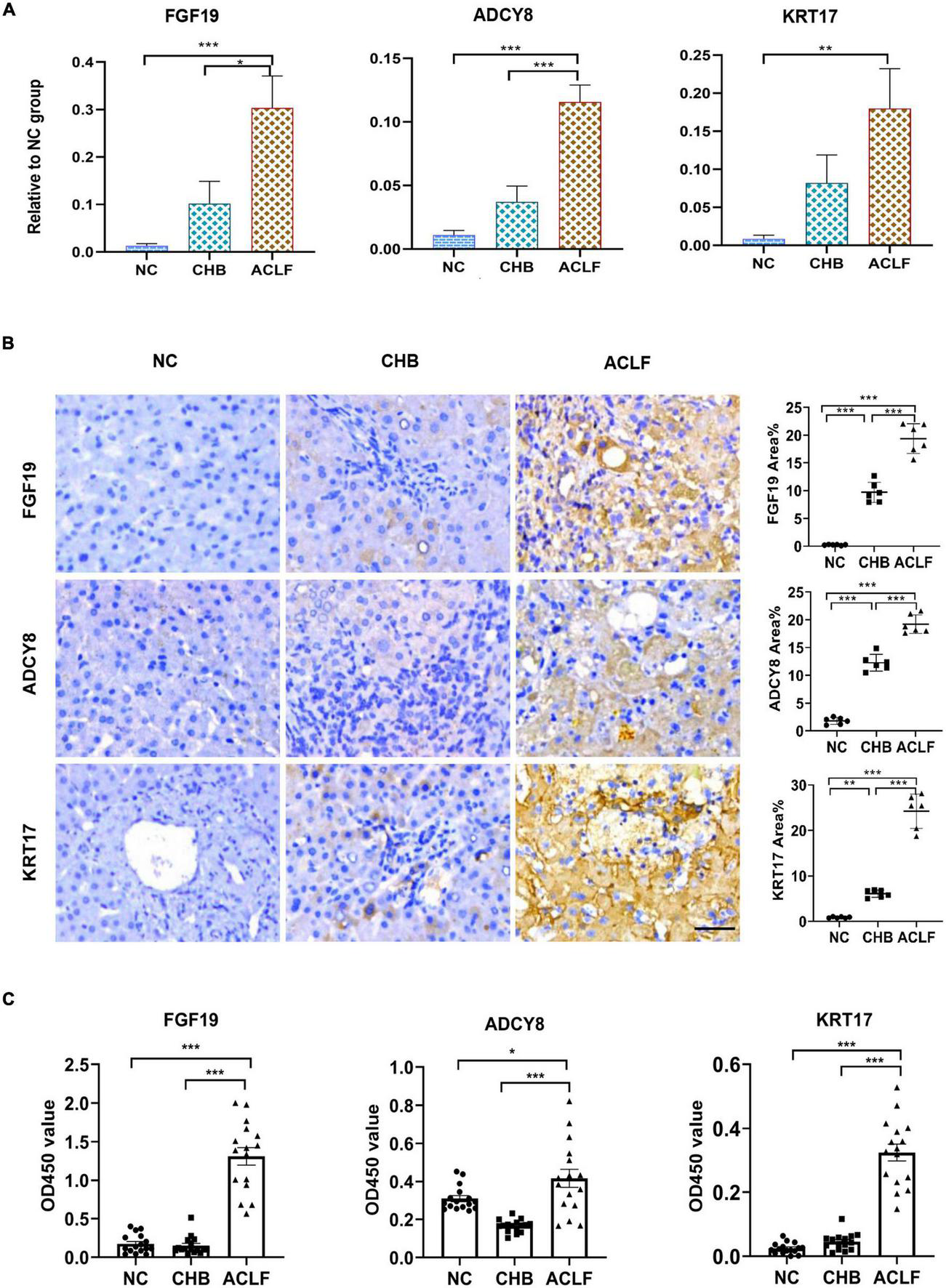 External validation by qRT-PCR and IHC staining in amplified human samples. (A) qRT-PCR validation of three genes (n = 10/10/10, NC/CHB/ACLF groups). (B) IHC and quantification of three key proteins involved in immunometabolic disorder in patients in the NC, CHB and HBV-ACLF validation cohort (bar = 50 μm). (C) Content of three markers in human serum (n = 16/16/16, NC/CHB/ACLF, respectively). The values are presented as the means ± SEMs. *Adjusted p < 0.05, **Adjusted p < 0.01, ***Adjusted p < 0.001. HBV, hepatitis B virus; ACLF, acute-on-chronic liver failure; CHB, chronic hepatitis B; NC, normal control; FGF19, fibroblast growth factor 19; ADCY8, adenylate cyclase 8; KRT17, keratin 17; IHC, immunohistochemical.