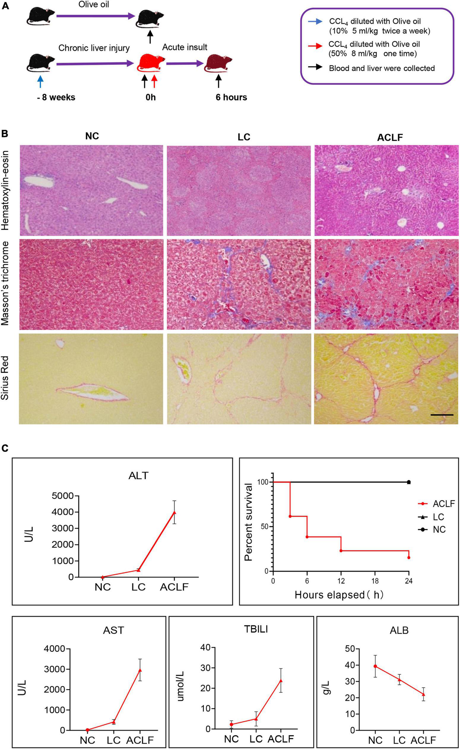 We established mouse models of acute-on-chronic liver injury by combining chronic injury and acute hepatic insult to mimic ACLF conditions. Six-week-old male C57BL/6J mice were used for all experiments. All mice were randomly allocated to the groups. The CCl4-induced liver cirrhosis model (LC) was established via intraperitoneal injection of 10% CCl4 (Macklin C805332, Shanghai, China) dissolved in an olive oil solution (Macklin O815211, Shanghai, China) (5 ml/kg body weight) twice weekly for 8 weeks. Mice in the ALCF group were injected with 50% CCl4 (8 ml/kg body weight) in the last injection based on the stage of cirrhosis and were killed 6 h later. Mice in the control group were intraperitoneally injected with only olive oil (5 ml/kg body weight) twice weekly for 8 weeks. Six animals per group were used for the above studies. The levels of ALT, AST, TBIL, and ALB were measured on a Hitachi 7600 automatic biochemical analyzer.