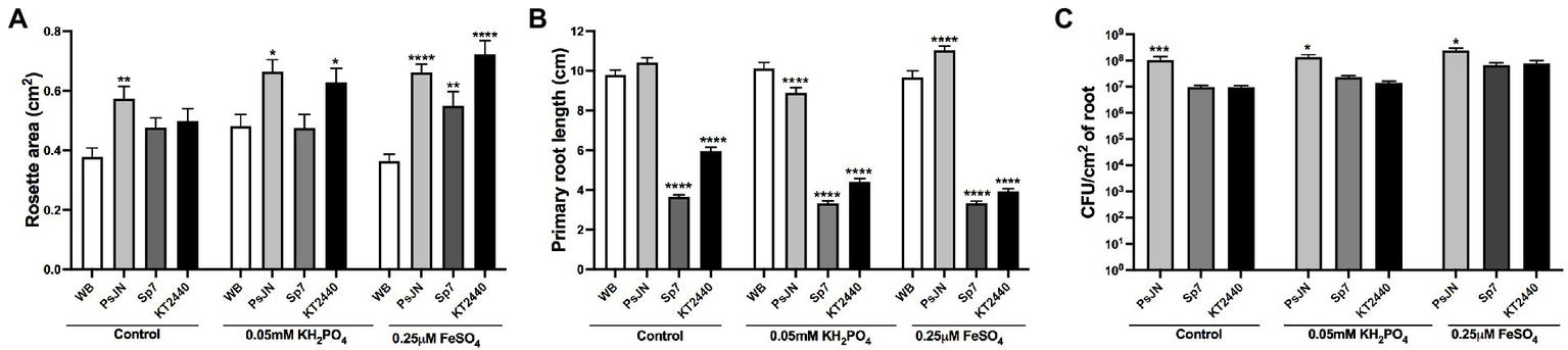 Effects of different phosphate and iron concentrations in plant growth in Arabidopsis thaliana inoculated with beneficial rhizobacteria. Rosette area (A), primary root length (B), and root colonization (C) in plants 15 days after sowing in control medium (1 mM KH2PO4/100 μM FeSO4), low-P (0.05 mM KH2PO4/100 μM FeSO4), or low-Fe (1 mM KH2PO4/0.25 μM FeSO4). Non-inoculated plants are noted as WB, and inoculations with Paraburkholderia phytofirmans PsJN, Azospirillum brasilense Sp7, or Pseudomonas putida KT2440 are noted as PsJN, Sp7, and KT2440, respectively. Data are means ± SE of 18 replicates per treatment. Asterisks indicate significant differences between each treatment and the control group according to a Two-way ANOVA with multiple comparisons test (*p < 0.05; **p < 0.01; ***p< 0.001; and ****p < 0.0001).