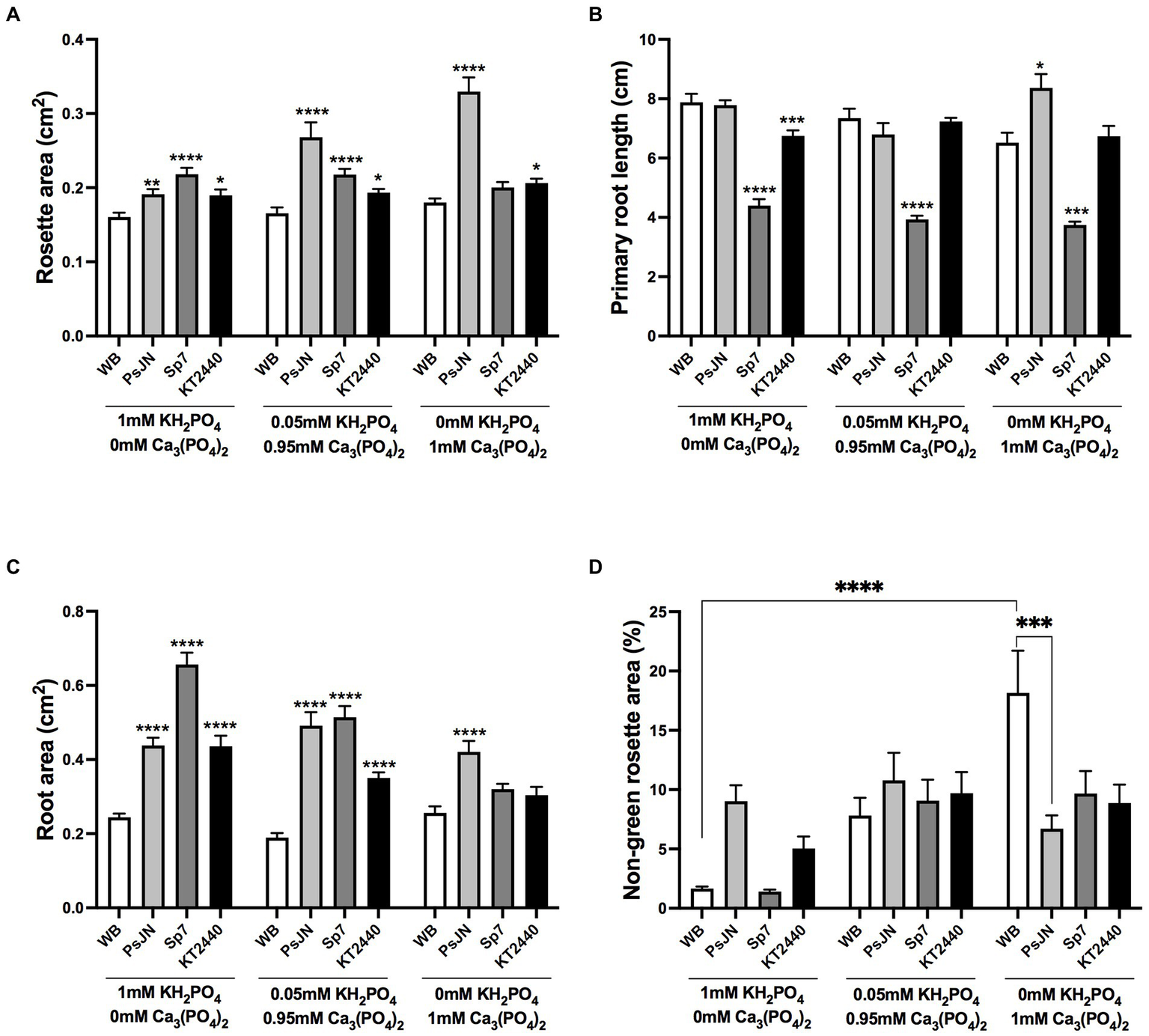 Effects of different sources of phosphorus in plant growth and stress parameters in Arabidopsis thaliana inoculated with beneficial rhizobacteria. Rosette area (A), primary root length (B), root area (C), and non-green rosette area (D) in plants 15 days after sowing in media with different concentrations of KH2PO4 or Ca3(PO4) as a phosphate source with high or low solubility, respectively (Factor 1). A second factor corresponds to the inoculation, where non-inoculated plants are noted as WB, and inoculations with Paraburkholderia phytofirmans PsJN, Azospirillum brasilense Sp7, or Pseudomonas putida KT2440 are noted as PsJN, Sp7, and KT2440, respectively. Data are means ± SE of 30 replicates per treatment. In the case of A and B panels, asterisks indicate significant differences between each treatment and their respective WB treatment (Kruskal–Wallis test, *p < 0.05; **p < 0.01; ***p< 0.001; and ****p < 0.0001). For panel C, only some significant differences are indicated with lines as asterisks, according to a Two-Way ANOVA with multiple comparisons *p < 0.05; **p < 0.01; ***p < 0.001; and ****p < 0.0001.