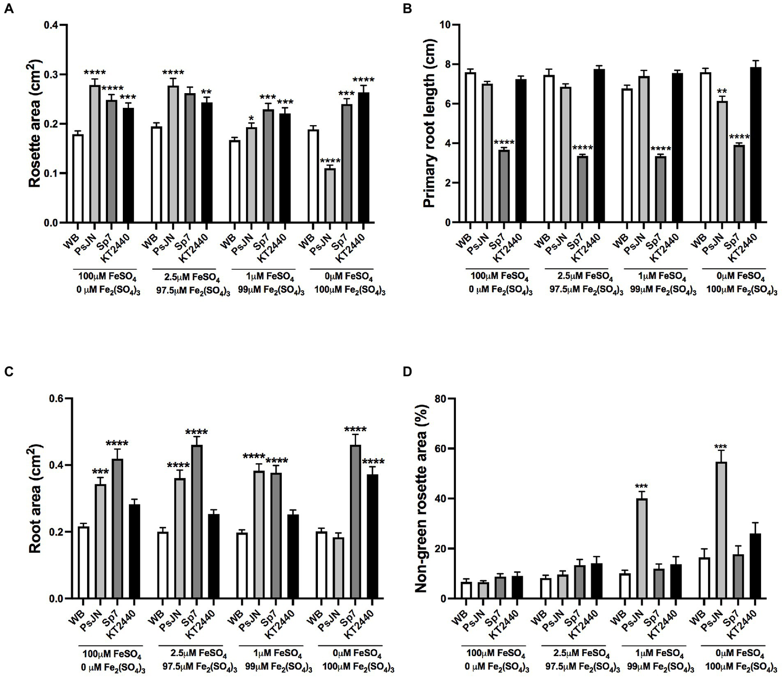 Effects of different sources of iron in plant growth and stress parameters in Arabidopsis thaliana inoculated with beneficial rhizobacteria. Rosette area (A), primary root length (B), root area (C), and non-green rosette area (D) in plants 15 days after sowing in media with different concentrations of FeSO4 or Fe2(SO4)3, as an iron source with high or low solubility, respectively (Factor 1). A second factor corresponds to the inoculation, where non-inoculated plants are noted as WB, and inoculations with Paraburkholderia phytofirmans PsJN, Azospirillum brasilense Sp7, or Pseudomonas putida KT2440 are noted as PsJN, Sp7, and KT2440, respectively. Data are means ± SE of 30 replicates per treatment. Asterisks indicate significant differences between each treatment and their respective WB treatment (Kruskal–Wallis test, *p < 0.05; **p < 0.01; ***p< 0.001; and ****p < 0.0001).
