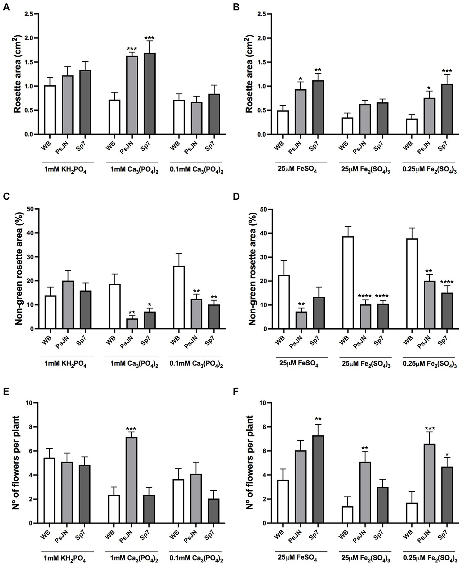 Long-term effects of different sources of phosphorus and iron in plant growth and flowering in Arabidopsis thaliana inoculated with beneficial rhizobacteria. Rosette area (A,B), non-green rosette area (C,D), and the number of flowers per plant (E,F) in plants 34 days after sowing. Factor 1 consisted of different concentrations of KH2PO4/Ca3PO4 (as phosphate sources with different solubilities; A,C,E) or FeSO4/Fe2(SO4)3 (as iron sources with different solubilities; B,D,F). Factor 2 consisted of non-inoculated plants (WB) or inoculated with Paraburkholderia phytofirmans PsJN (PsJN) or Azospirillum brasilense Sp7 (Sp7). Data are means ± SE of 20 replicates per treatment. Asterisks indicate significant differences between each treatment and their respective WB treatment (Two-way ANOVA and Tukey multiple comparisons, *p < 0.05; **p < 0.01; ***p< 0.001, and ****p < 0.0001).