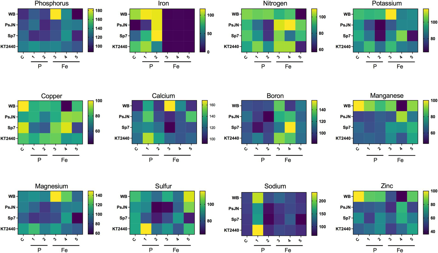 Effects on the nutrient content of Arabidopsis thaliana plants of different sources of phosphorus and iron and the inoculation with beneficial rhizobacteria. The nutritional treatments are indicated in the X-axis of the figures, being (C) the full culture media, 1 mM KH2PO4 and 100 μM FeSO4; (1) 0.05 mM KH2PO4/0.95 mM Ca3PO4; (2) 0.05 mM KH2PO4; (3) 25 μM FeSO4; (4) 0.25 μM FeSO4/24.75 μM, and (5) 0.25 μM FeSO4. The Y-axis represents the inoculation treatments, with (WB) without bacteria; (PsJN) Paraburkholderia phytofirmans PsJN; (Sp7) Azospirillum brasilense Sp7 (Sp7), and (KT2440) Pseudomonas putida KT2440. Each square represents data relative to the C/WB treatment (100%). The color from yellow to blue indicates high to low nutrient levels.