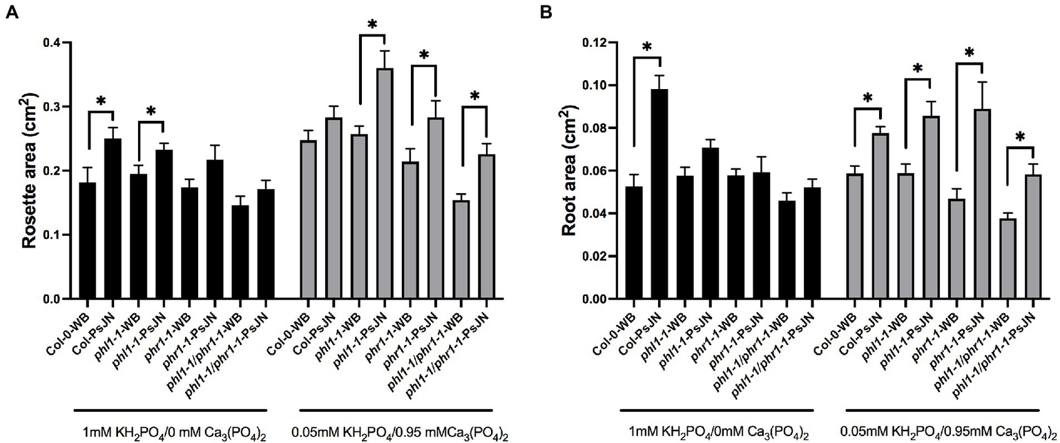 Effects of different sources of phosphorus and inoculation with beneficial rhizobacteria in the growth of phr1 and phl1 Arabidopsis thaliana mutants in phosphate starvation response. Rosette (A) and root area (B) in plants 15 days after sowing. Factor 1 consists of different concentrations of KH2PO4/Ca3PO4 (as phosphate sources with different solubilities). Factor 2 consists of non-inoculated plants (WB) or inoculated with Paraburkholderia phytofirmans PsJN (PsJN). Factor 3 consists of the genotype of Arabidopsis plants (Col-0; the single mutants phl1-1 or phr1-1 and the double mutant phl1/phr1-1). Asterisks indicate significant differences in paired comparison for each genotype (WB versus PsJN inoculation) according to a non-parametric Mann-Whitney test (*p < 0.05).