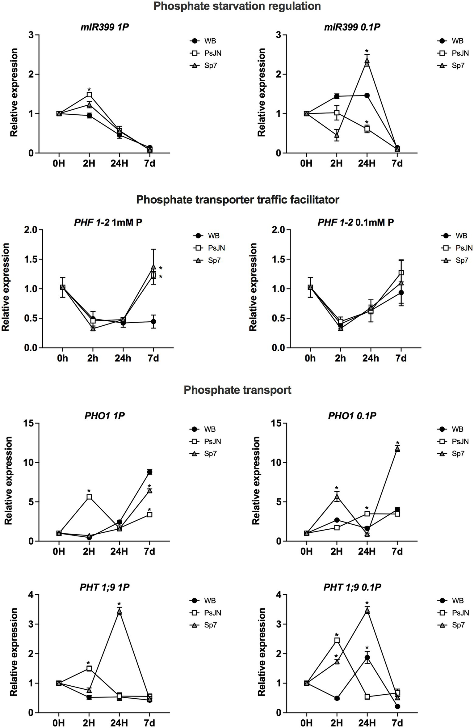 SUPPLEMENTARY FIGURE 1Effects of beneficial bacteria on phosphate homeostasis-related genes in Arabidopsis thaliana grown in different phosphate sources. Quantitative RT-PCR determinations of relative expression levels of the genes related to phosphate homeostasis PHR1-1 (PHOSPHATE STARVATION RESPONSE 1); PHL (PHR1-LIKE 1); PHT1;1 (PHOSPHATE TRANSPORTER 1;1); PHT1;4. (PHOSPHATE TRANSPORTER 1;4), and PHO2 (PHOSPHATE 2). Plants were exposed to 1mm KH2PO4 and 0mM Ca3PO4 (Left panel) or 0.1mm KH2PO4/0.99mM Ca3PO4 (right panel) for 0, 2, 24 h or 7 days (d). Simultaneously, plants were non-inoculated (WB) or inoculated with Paraburkholderia phytofirmans PsJN (PsJN) or Azospirillum brasilense Sp7 (Sp7). Normalization was performed with the housekeeping SAND family gene (AT2G28390). Asterisks indicate statistical significance among treatments in a particular time compared to the WB group (Two-way ANOVA and multiple comparisons, p < 0.05).