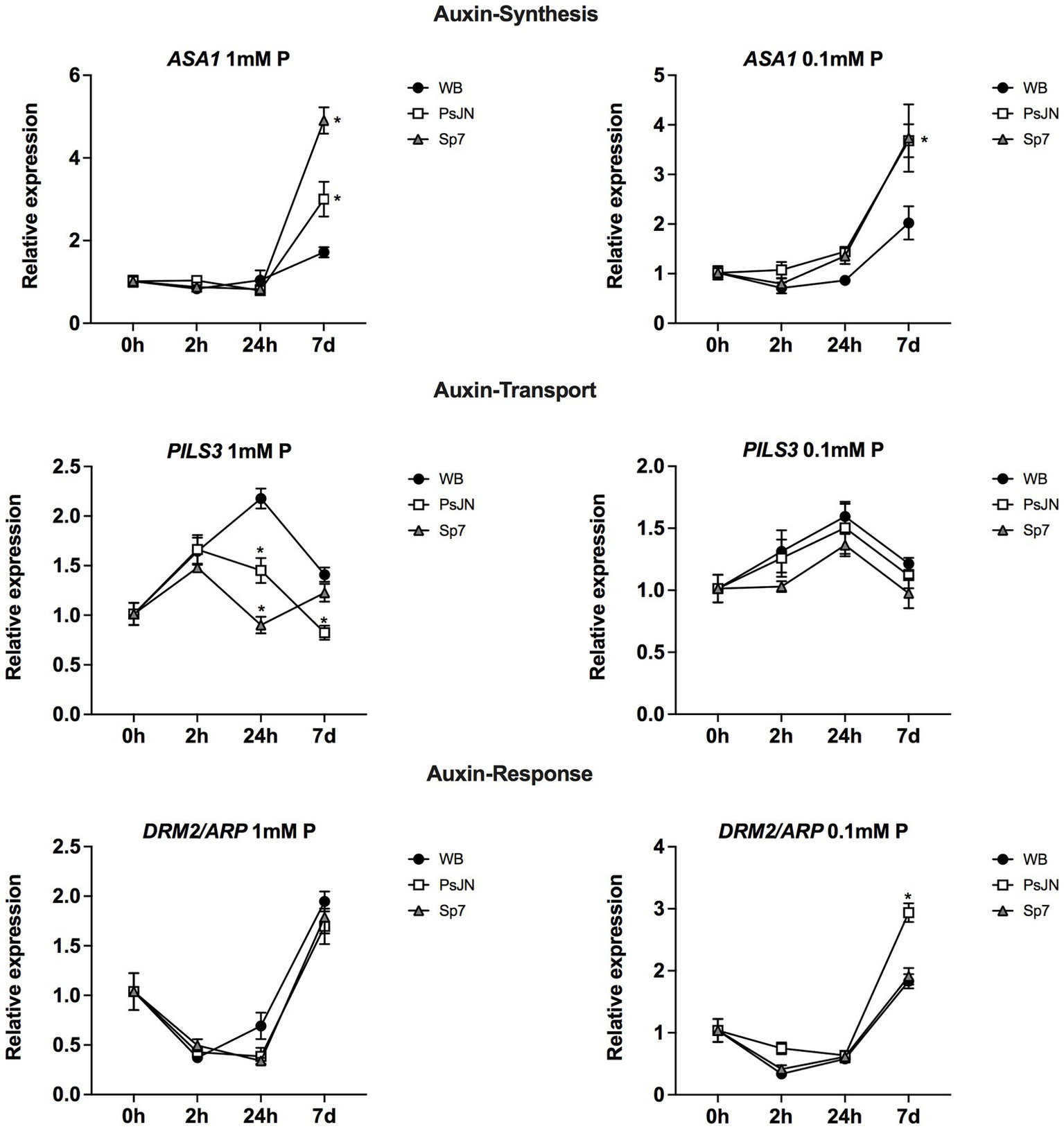 Effects of beneficial bacteria on auxin-related genes in Arabidopsis thaliana grown in different phosphate sources. Quantitative RT-PCR determinations of relative expression levels of the genes related to auxin synthesis ASA1 (ANTHRANILATE SYNTHASE ALPHA SUBUNIT 1); transport PILS3 (PIN-LIKES 3), and response DRM2/ARP1 (DORMANCY ASSOCIATED GENE-1/AUXIN-REPRESSED PROTEIN). Plants were exposed to 1 mm KH2PO4/0 mM Ca3PO4 (Left panel) or 0.1 mm KH2PO4/0.99 mM Ca3PO4 (right panel) for 0, 2, 24 h or 7 days (d). Simultaneously, plants were non-inoculated (WB) or inoculated with Paraburkholderia phytofirmans PsJN (PsJN) or Azospirillum brasilense Sp7 (Sp7). Normalization was performed with the housekeeping SAND family gene (AT2G28390). Asterisks indicate statistical significance among treatments in a particular time compared to the WB group (Two-way ANOVA and multiple comparisons, p < 0.05).