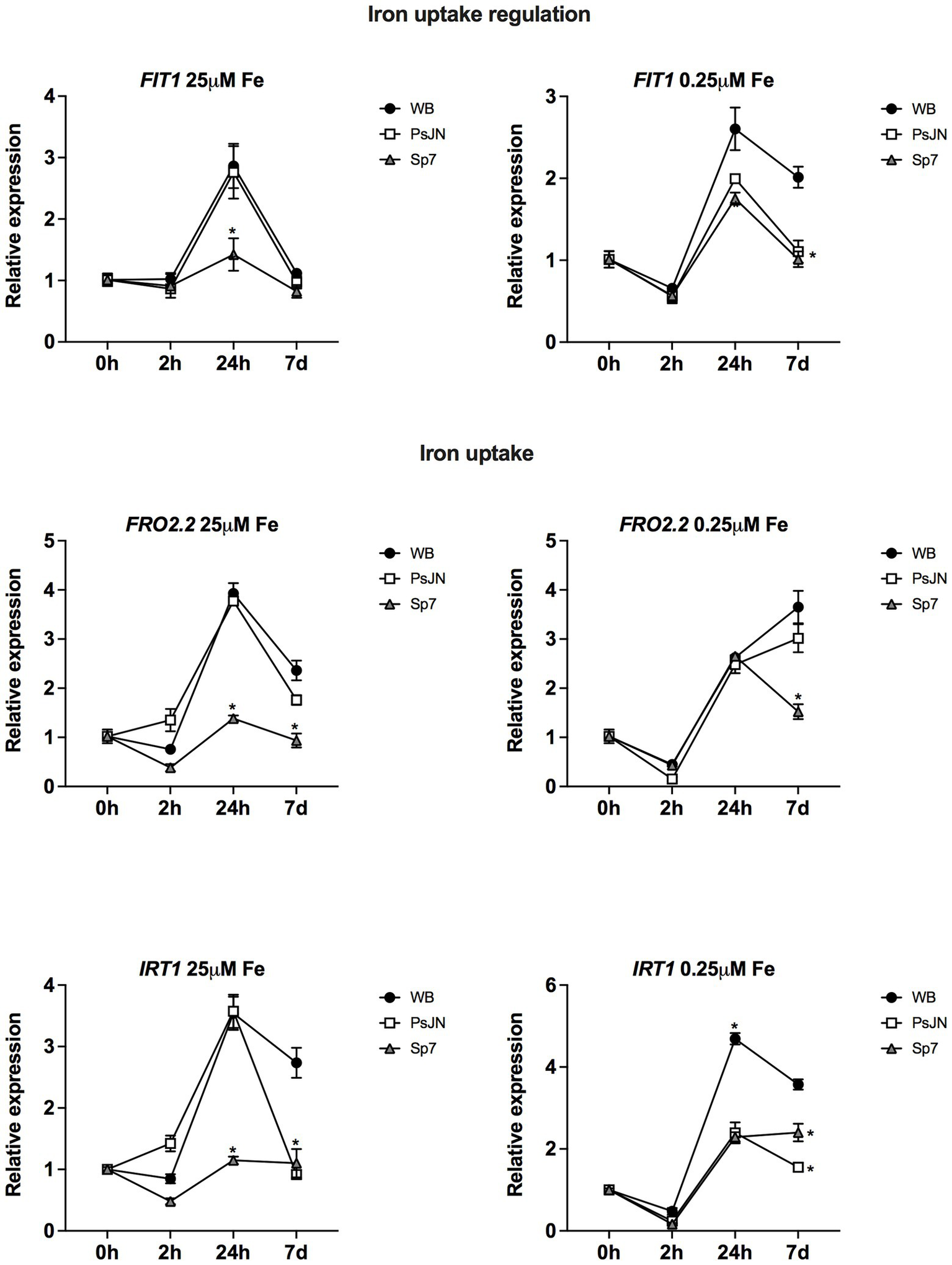 Effects of beneficial bacteria on iron uptake-related genes in Arabidopsis thaliana grown in different phosphate sources. Quantitative RT-PCR determinations of relative expression levels of the genes related to iron uptake regulation FIT1 (ARABIDOPSIS FE-DEFICIENCY INDUCED TRANSCRIPTION FACTOR 1); and uptake FRO2.2 (FERRIC REDUCTASE OXIDASE 2.2) and IRT1 (IRON-REGULATED TRANSPORTER 1). Plants were exposed to 25 μM FeSO4/0 μM Fe2(SO4)3 as a highly soluble iron source (left panel) or 0.25 μM FeSO4/24.75 μM Fe2(SO4)3 as an iron source with low solubility (right panel) for 0, 2, 24 h or 7 days (d). Simultaneously, plants were non-inoculated (WB) or inoculated with Paraburkholderia phytofirmans PsJN (PsJN) or Azospirillum brasilense Sp7 (Sp7). Normalization was performed with the housekeeping SAND family gene (AT2G28390). Asterisks indicate statistical significance among treatments in a particular time compared to the WB group (Two-way ANOVA and multiple comparisons, p < 0.05).