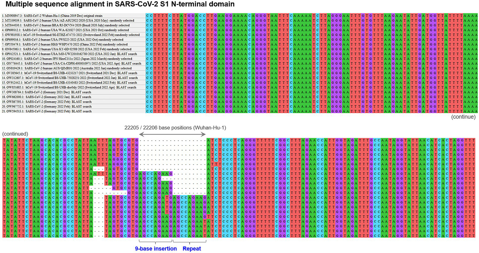 The pandemic of coronavirus disease 2019 (COVID-19), caused by severe acute respiratory syndrome coronavirus 2 (SARS-CoV-2), is still ongoing worldwide still in end of 2022 (Alexandridi et al., 2022; Biancolella et al., 2022). The pandemic has been sustained in the last 3 years, driven by the intermittent emergence of consequential variant strains (Papanikolaou et al., 2022; Viana et al., 2022). By now, the lineages of the variant strains have been classified mainly based on the types of point mutations in the spike (S) gene of the virus. This is reasonable because SARS-CoV-2 Sprotein has been known to play major roles in binding to the receptor angiotensin-converting enzyme 2 (ACE2) and also as the target antigen of most neutralizing antibodies (Liu et al., 2020; Zhang et al., 2020; Min and Sun, 2021). Recently, the genomes of many SARS-related coronavirus species, including SARS-CoV-2 from humans, have reported to incorporate many mutation hotspots with relatively long and highly divergent insertions/deletions (indels; Akaishi, 2022b; Akaishi et al., 2022b), which are not common in many of other virus families (Willemsen and Zwart, 2019; Akaishi, 2022a). These indel hotspots with highly divergent RNA sequences in SARS-related coronavirus species were identified to be clustered in several specific genome positions, including the non-structural protein 2 (Nsp2) and Nsp3 of the open-reading frame 1a (ORF1a), N-terminal domain (NTD) of S gene, and ORF8 gene (Akaishi et al., 2022a). Many of these divergent and complex indel hotspots are away from the known genomic recombination sites in the viruses (Alexandridi et al., 2022; Lytras et al., 2022). However, the genomic regions and patterns of highly polymorphic indel sites in the genomes of SARS-CoV-2 from humans have not been enough evaluated until now. Moreover, the geographical distributions and prevailing periods of each indel pattern remains largely unevaluated. Therefore, in this report, we searched for the polymorphic indel hotspots in the genomes of SARS-CoV-2 collected from humans and estimated the time period and geographical locations of the emergence of such polymorphic indels. Furthermore, we are going to report an insertion site with variable number tandem repeat of 9-base insertion, found in the NTD of the SARS-CoV-2 S gene.