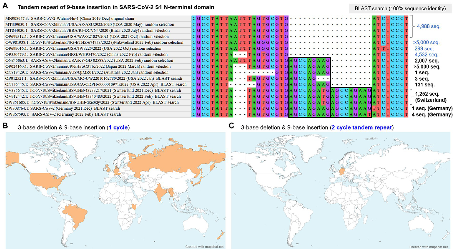 BLAST search results and geographic distribution of two-cycle tandem repeat of the 9-base insertion. (A) The aligned sequences at the identified polymorphic indel hotspot in SARS-CoV-2 S1-NTD are shown, together with the numbers of identified sequences with 100% sequence identity for each sequence based on the NCBI BLAST search. Both of the one-cycle and two-cycle tandem repeat of the 9-base insertion were dated from the November 2021 in Switzerland. The two-cycle tandem repeat did not spread across the globe, whereas the one-cycle 9-base insertion rapidly spread across the globe in 2022, estimated to account for 20–50% of the overall SARS-CoV-2 sampled from humans in 2022. (B,C) Geographic distributions of the one-cycle and two-cycles of the 9-base insertion with the nearby 3-base deletion. Although both cycles were suggested to originate in November 2021 in central Europe, the former rapidly spread across the globe, whereas the latter was limited in Switzerland. BLAST, basic local alignment search tool; S1-NTD, N-terminal domain of S1 gene; SARS-CoV-2, severe acute respiratory syndrome coronavirus 2.