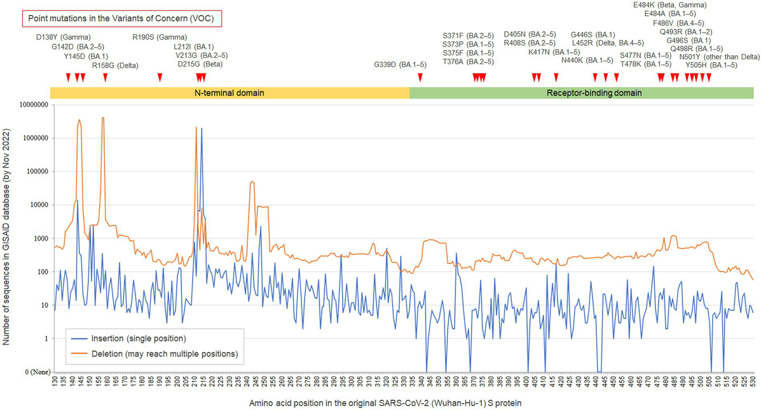 GISAID database search for the insertions/deletions in the N-terminal domain and receptor-binding domain of SARS-CoV-2 spike gene. The line graphs show the numbers of sequences sampled from humans with insertions/deletions (indels) at each amino acid position in the N-terminal domain (NTD) and receptor-binding domain (RBD) of the SARS-CoV-2 spike gene, which were registered in the GISAID database by December 01, 2022. The observed variable numbers tandem repeat of this study matches to the peak of insertion at 214 amino acid position of the S1-NTD. The asymmetrical line graphs suggest the different tolerability for incorporating indels between the SARS-CoV-2 S1-NTD and the S1-RBD, with a lower tolerability in the S1 RBD. The Y-axis scale is logarithmic.