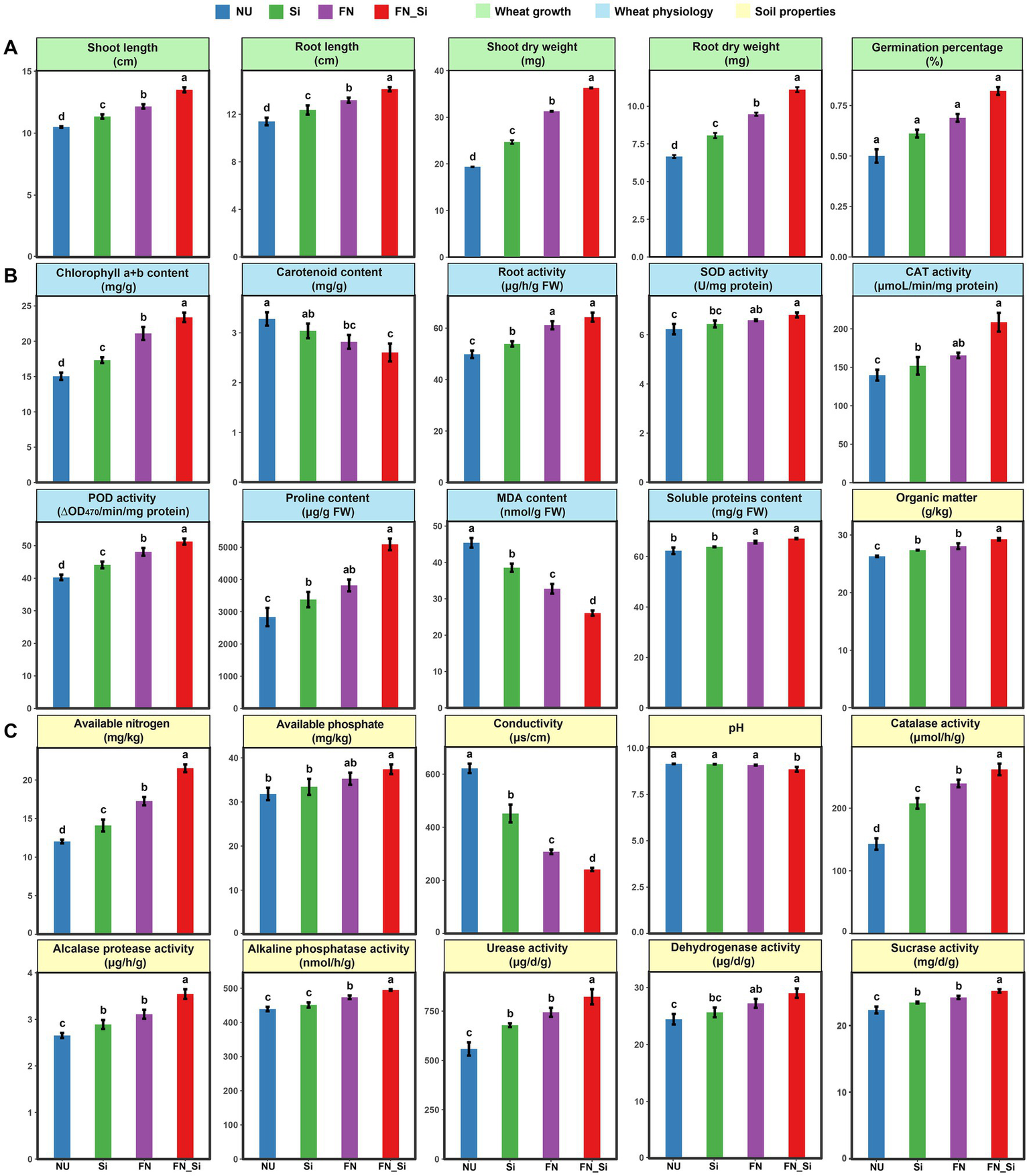(A) Wheat growth, (B) wheat physiology, and (C) soil properties. Error bars indicate the SD from the mean among treatments. Letters indicate significant differences at p < 0.05.
