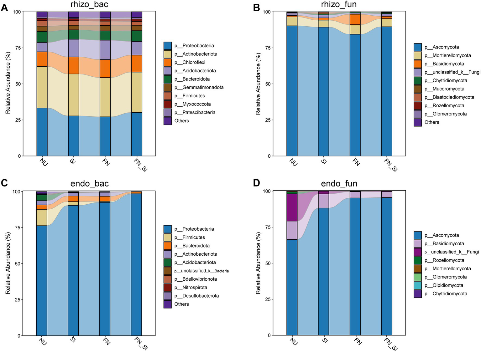 (A) Rhizosphere bacterial community, (B) rhizosphere fungal community, (C) root endophytic bacterial community, and (D) root endophytic fungal community composition at phylum level.