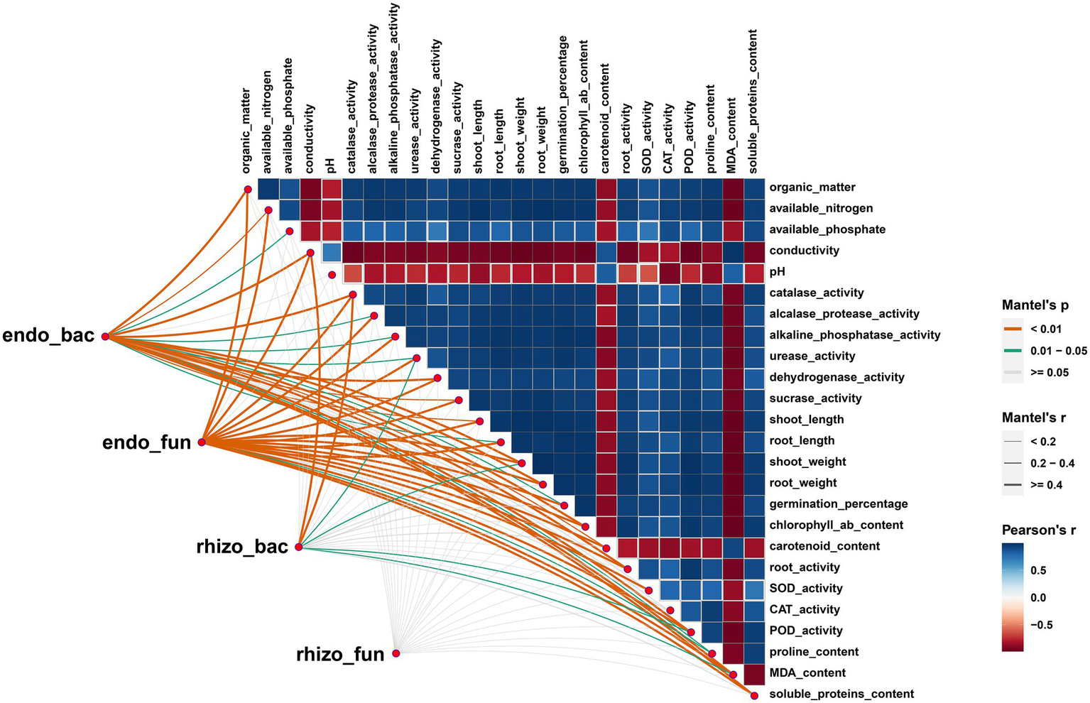 Mantel test showed the correlation among root-associate microorganisms, wheat physiology and soil properties. The size of square represents Pearson Correlation Coefficient (r) among different physiology properties factors.