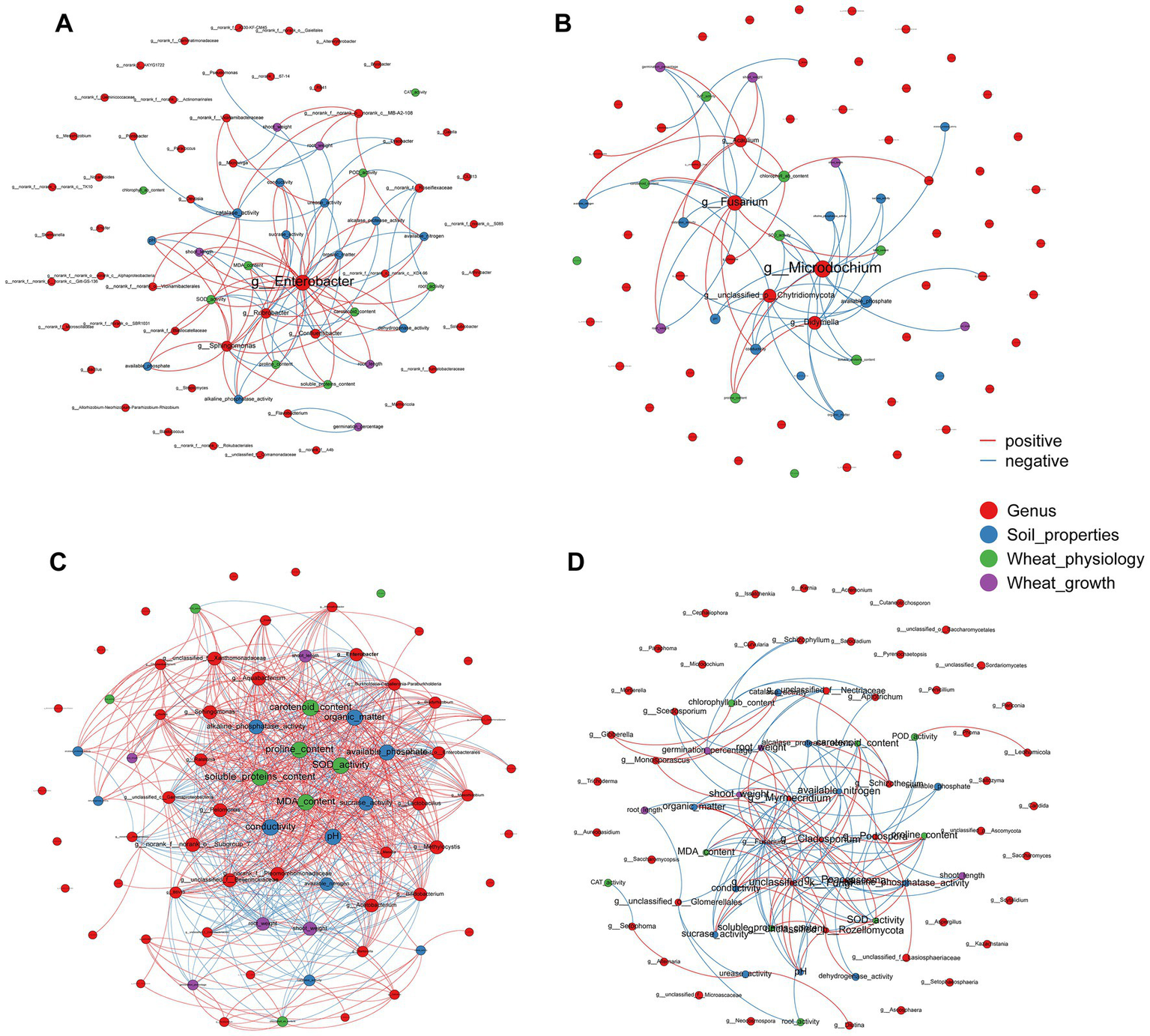 Network analysis depicting an interaction pattern among generals of (A) rhizosphere bacterial communities, (B) rhizosphere fungal communities, (C) root endophytic bacterial communities, and (D) root endophytic fungal communities, wheat physiology, soil properties and wheat growth. The size of nodes and labels represent the degree of connection. The red line indicated the positive interaction and blue line indicated negative interaction. The top 50 species with|r| > 0.6 and p < 0.05 were retained.
