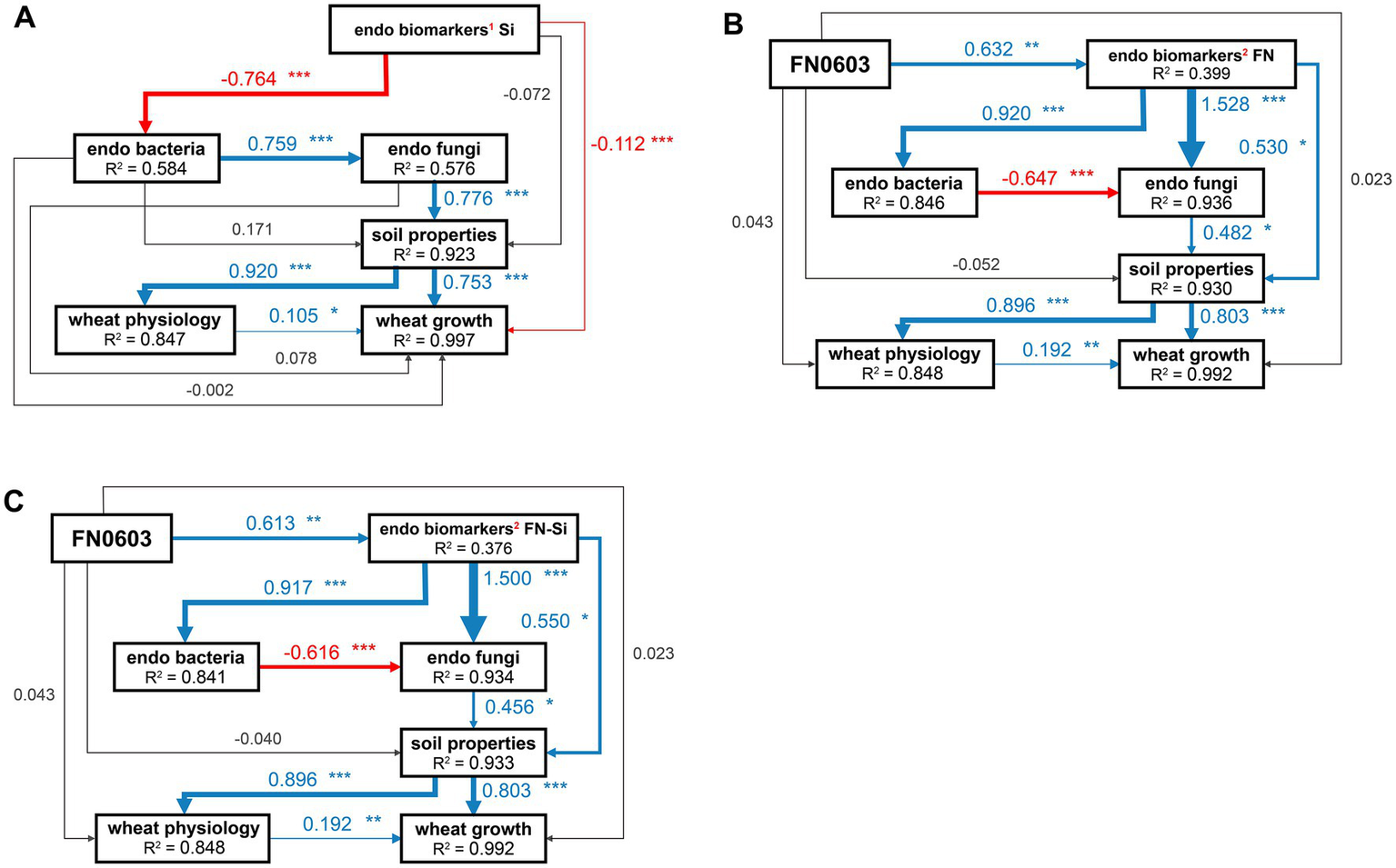 Structural equation model (SEM) analyzing the directly and indirectly effect paths of (A) Si, (B) FN and (C) FN_Si on wheat growth through specific biomarkers, root endophytic microorganisms, soil properties, and wheat physiology. Numbers adjacent to each arrow are the standardized path coefficients. The width of each arrow is proportional to the strength of its corresponding path coefficient. R2 denotes the proportion of variance explained. Blue and red arrows indicate positive and negative relationships, gray line indicate non-significant relationships, respectively. * Represents a significant difference (***p < 0.001; **p < 0.01; *p < 0.05), 1represents not FN-specific biomarkers, 2represents FN-specific biomarkers.