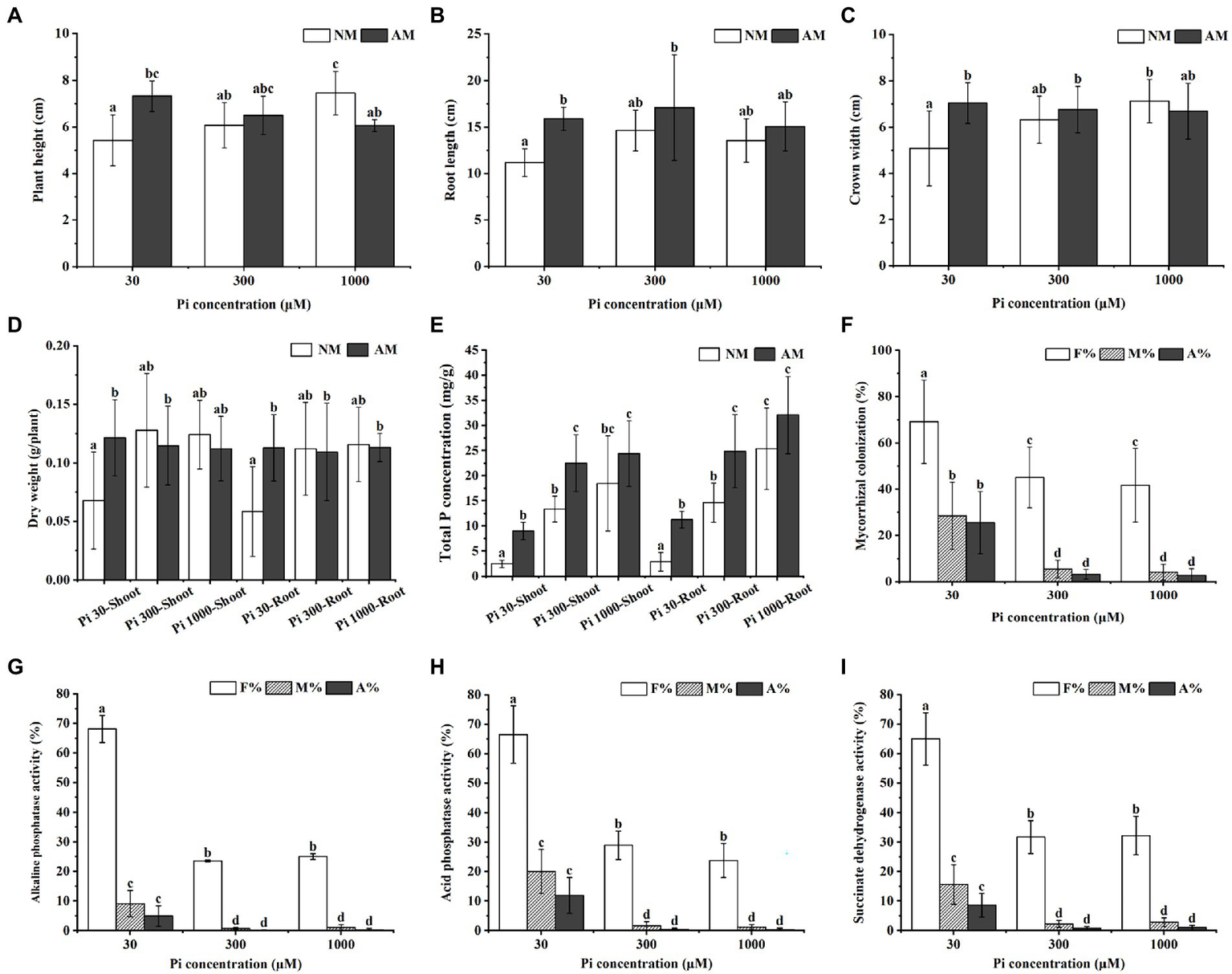 Impact of different Pi concentrations and AMF colonization on Eucalyptus grandis growth and enzyme activities within mycorrhizal roots. (A–D) The growth performances of NM and AM E. grandis plants under different phosphate concentrations. (E) Total P concentrations of shoots and roots of NM and AM E. grandis with R. irregularis grown at different Pi levels. (F) Mycorrhizal colonization levels among different phosphate concentrations were determined in roots after the WGA488 staining. (G–J) Impact of phosphate concentrations on three enzymes activities, including alkaline phosphatase (ALP), acid phosphatase (ACP) and succinate dehydrogenase (SDH), which are involved in AM fungal metabolism and Pi homeostasis during symbiosis. Data on the pictures are obtained by the ALP (G), ACP (H), and SDH (I) activities staining, respectively. (F–I) F%, the total colonization frequency; M%, the percentage of mycorrhizal intensity; A%, the percentage of arbuscule abundance. Error bars represent the mean of five biological replicates ± SD. Averages with the different letters on the top of the column mean significantly differences at p < 0.05 level, based on Duncan’s new multiple range test.
