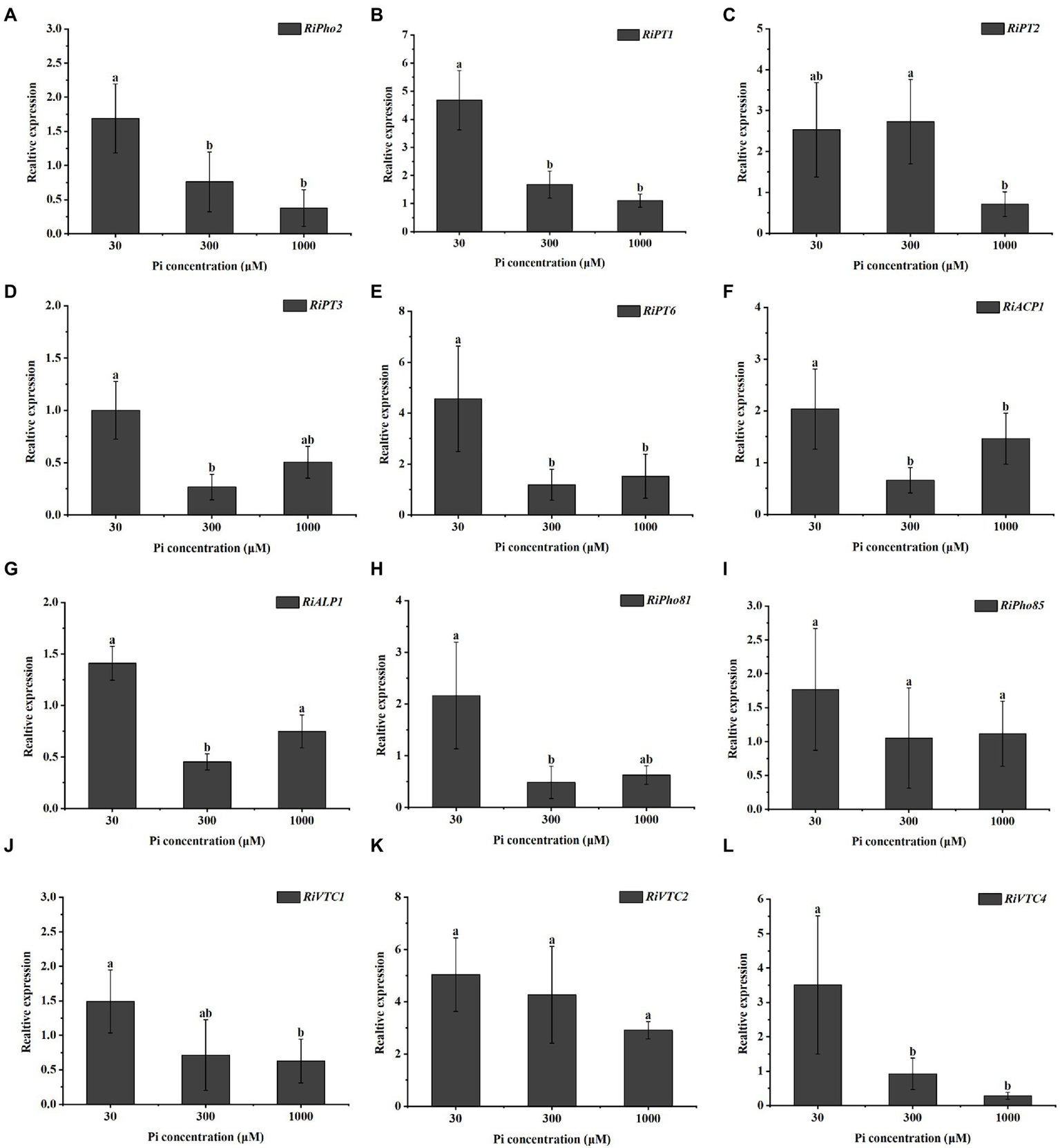 Expression profiles of the genes involved in the phosphate (PHO) signaling pathway from R. irregularis in mycorrhizal E. grandis roots at different phosphate concentrations. (A–L) Expression levels of genes of PHO pathway under different phosphate concentrations, including (A) transcription cofactor, (B–E) Pi transporters, (F,G) phosphatase related genes, (H,I) cyclin-protein genes and (J–L) vacuolar transporters, suggesting that the expressions of PHO pathway genes are affected by phosphate concentrations. AM fungal RiEF1α is set as the reference gene. The data represent the means of three biological replicates with standard deviations. Different letters indicate the Duncan’s multiple comparison results. Significance, p < 0.05.