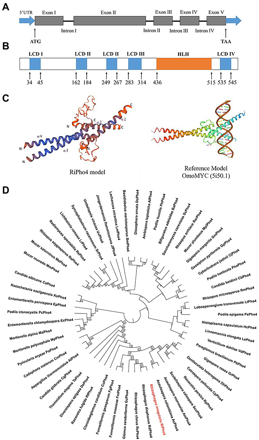 Gene and protein structures of RiPho4 in R. irregularis and the evolutionary relationships with Pho4 proteins in various fungi species. (A) The RiPho4 gene contains five exons and four introns, corresponding to gene ID 36869193. The untranslated regions (UTRs) are shown in the figure, ATG and TAA represent the translation start site and translation termination site, respectively. (B) Inferred protein domain of RiPho4. RiPho4 protein contains 570 amino acids and consists of one HLH domain and four low complex domains (LCDs) (http://smart.embl.de/). (C) Predicted three-dimensional structure of RiPho4 model by SWISS-MODEL. It was predicted that the 3D structure of RiPho4 is similar to that of OmoMYC (5i50.1), a protein encoded by MYC dominant-negative allele in Mus musculus (Jung et al., 2017). (D) The unrooted phylogenetic tree was constructed with the neighbor-joining method, based on multiple sequence alignments of RiPho4 (red color) and other Pho4 proteins from different fungi species using MEGA v7.0 software. Bootstrap tests were performed using 1,000 replicates. The accession numbers of all Pho4 proteins are provided in the Supplementary Table S2.