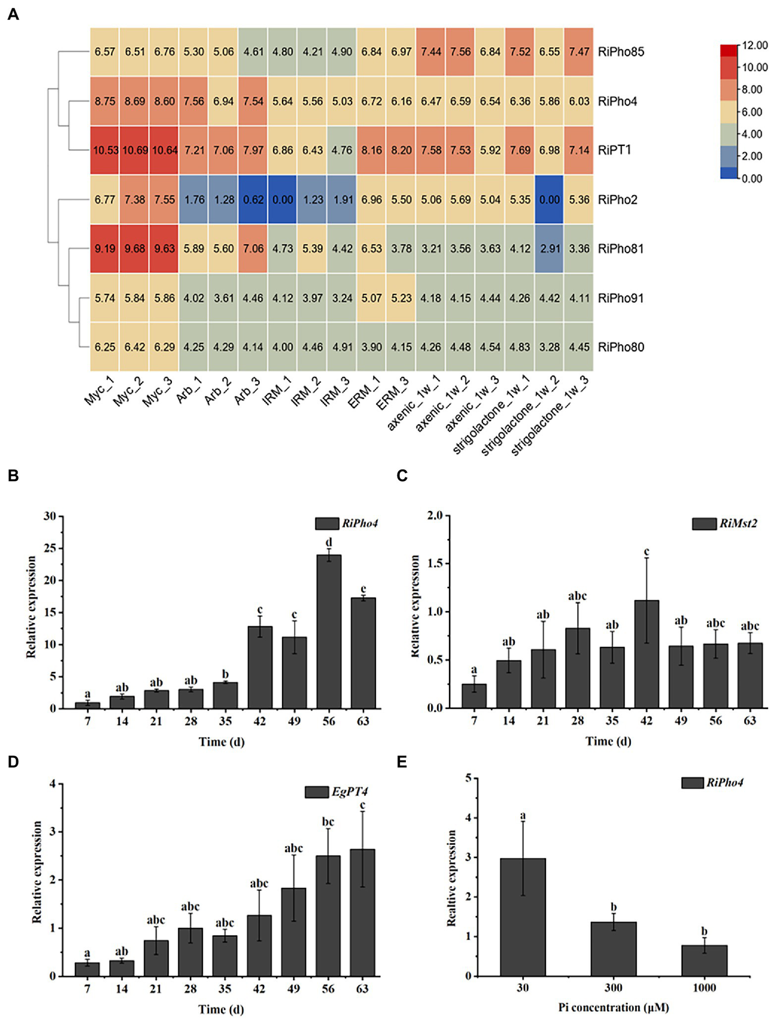 Spatiotemporal expression patterns of RiPho4 from the AM fungus R. irregularis. (A) Analysis of the heat diagram for transcriptional levels of RiPho4 and some PHO pathway genes in different fungal tissues: mycorrhizal roots of Medicago truncatula (Myc), arbuscules from M. truncatula mycorrhizal roots (Arb), intraradical mycelium (IRM), extraradical mycelium (ERM), axenic germinating spores harvested at a week after inoculation (axenic_1w) and germinating spores at 7 days after GR24 induction (strigolactone_1w). The heatmap of identities was visualized by the TBtools (Chen et al., 2020). (B–D) Time-course assay of the expression of RiPho4, RiMst2 and EgPT4 in E. grandis mycorrhizal roots after 7, 14, 21, 28, 35, 42, 49, 56 and 63 days (d) inoculation with R. irregularis. RiEF1α and EgUBI3 were used as the reference genes for R. irregularis and E. grandis gene normalization, respectively. (E) Expression analysis of RiPho4 in mycorrhizal roots of E. grandis grown under different phosphate concentrations. The error bars are the means with standard errors of three biological replications. Treatments with the same letters do not differ from others by the Duncan’s test at 5% probability.