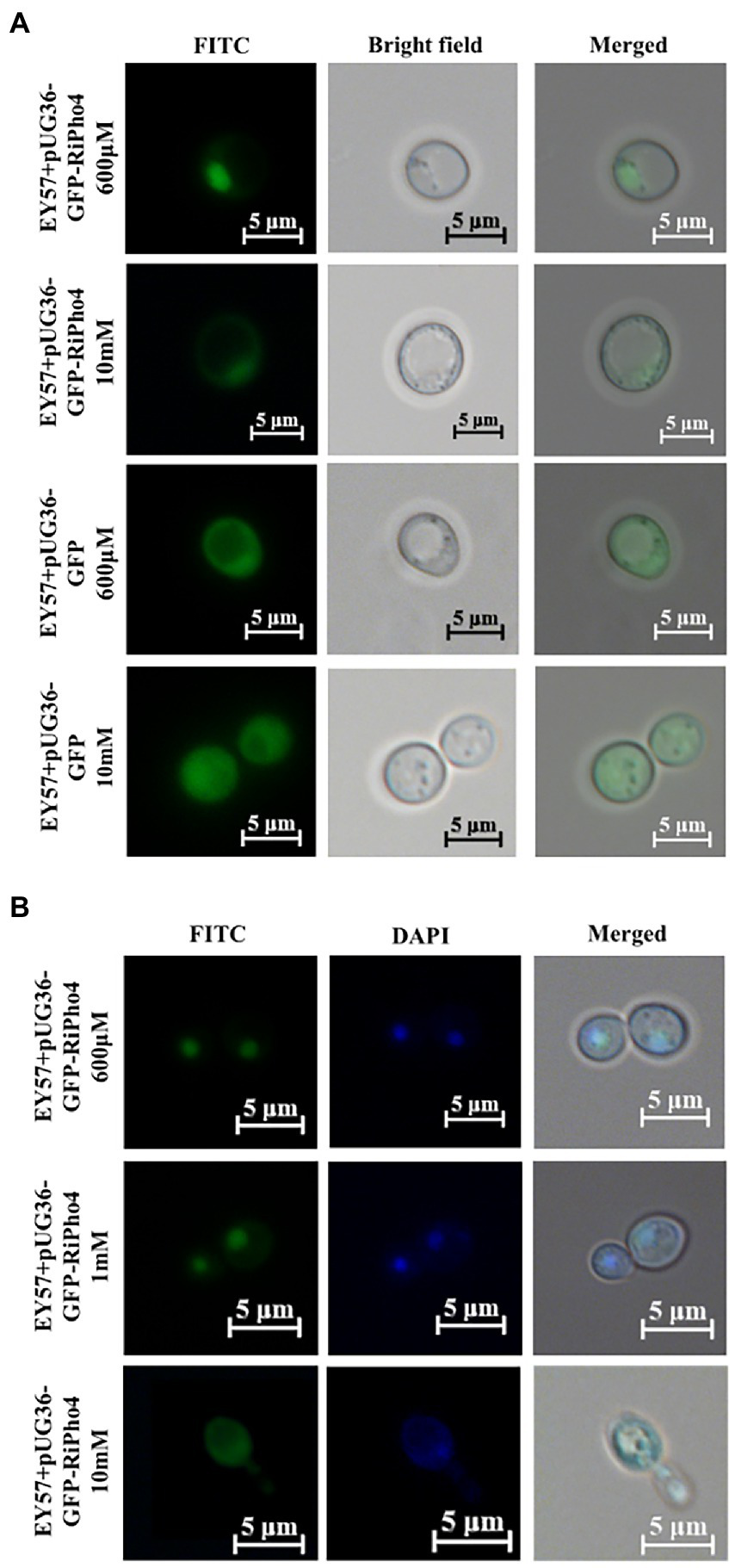 Subcellular localization of RiPho4 in Saccharomyces cerevisiae grown under different phosphate conditions. Fluorescence microscope images of S. cerevisiae EY57 cells expressing pUG36-GFP or pUG36-GFP-RiPho4. (A) Localization of RiPho4 was captured by fluorescence microscopy, the pUG36 containing the GFP reporter gene was used as the control, showing the fluorescence signal in the cytoplasm. The yeast cells were grown in YNB liquid medium with different Pi (600 μM, 10 mM KH2PO4) treatments for 12 h. (B) The transformed cells were grown in YNB medium under different Pi (600 μM, 1 mM, 10 mM K2HPO4) conditions for 12 h. FITC showed the green fluorescence channel; DAPI presented transformed yeast cells stained with DAPI dye. Scale bars, 5 μm.