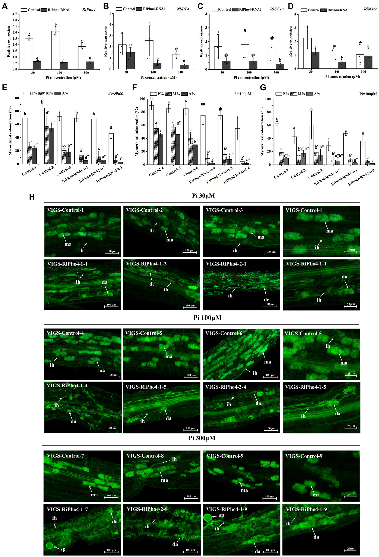 Molecular and arbuscular mycorrhizal phenotypes of virus-induced gene silencing (VIGS) of RiPho4 in tobacco (Nicotiana benthamiana) roots colonized by R. irregularis grown under different Pi conditions. (A–D) Expression levels of RiPho4, NbPT4, RiEF1α and RiMst2 in mycorrhizal tobacco RiPho4-RNAi roots under different phosphate conditions, estimated by quantitative RT-PCR. R. irregularis RiEF1a and N. benthamiana NbTEF1a were used as the endogenous genes for normalization of RiPho4, RiMst2, NbPT4 and RiEF1α expression, respectively. The data represented the means of three biological replicates. Bars indicated the standard errors of means. Means designated with the same letters are not significantly different (p ≥ 0.05) according to Duncan’s multiple range test. (E–G) Mycorrhizal colonization levels between the control and RiPho4-RNAi roots exposed to different Pi (30 μM, 100 μM and 300 μM K2HPO4) concentrations were determined after the WGA488 staining. F%, the total colonization frequency; M%, the percentage of mycorrhizal intensity; A%, the percentage of arbuscule abundance. (H) Fluorescence microscopic images of R. irregularis arbuscules in control and RiPho4-RNAi roots grown under different Pi conditions. The arrows and letters in the figure represent different structures of R. irregularis: ma, mature arbuscules; da, degraded arbuscules; de, dead arbuscules; ih, intraradical hyphae; sp., spores. Scale bars, 100 μm (1–3 columns), 25 μm (the 4th column).
